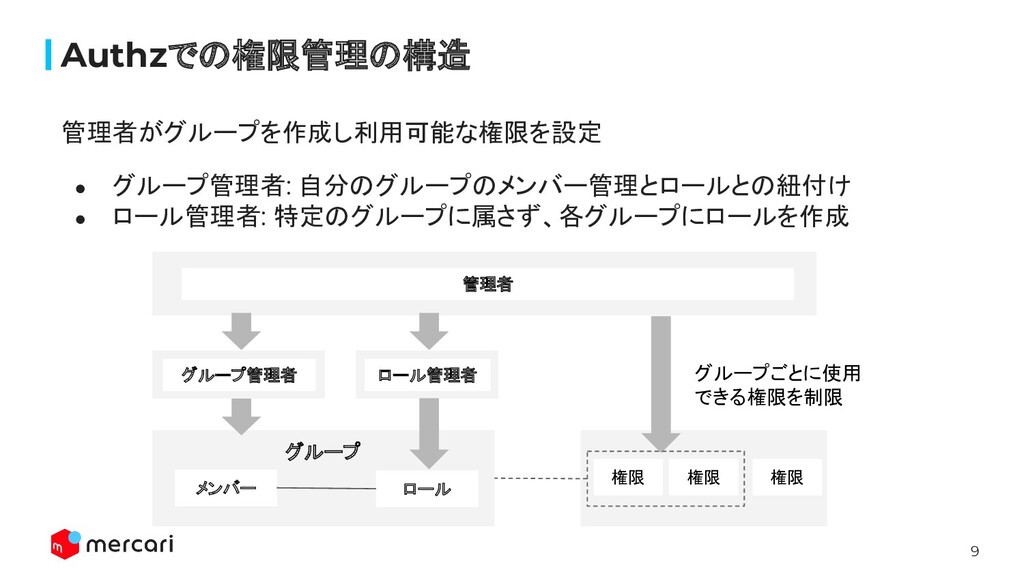9 Authzでの権限管理の構造 管理者がグループを作成し利用可能な権限を設定 • グループ管理者: 自分のグループのメンバー管理とロールとの紐付け • ロール管理者: 特定のグループに属さず、各グループにロールを作成 グループ