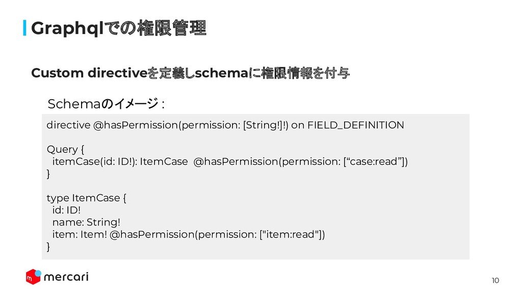 10 Graphqlでの権限管理 Custom directiveを定義しschemaに権限情報を付与 directive @hasPermission(permission: [String!]!) on FIELD_DEFINITION Query