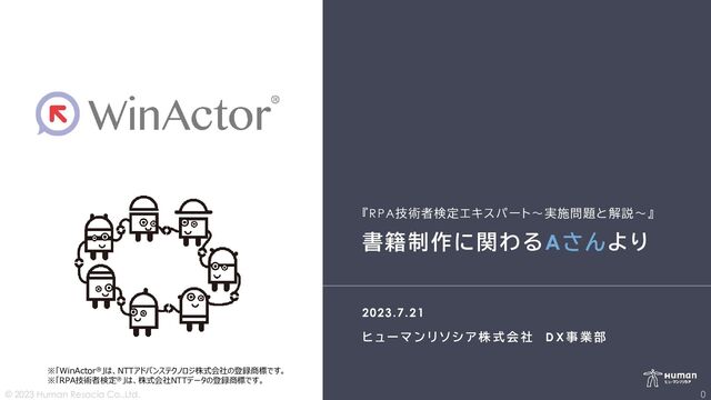 株 式 会 社 D X 事 業 部 『RPA技術者検定エキスパート~実施問題と解説~』 書籍制作に関わるAさんより 2023.7.21 © 2023 Human Resocia Co.,Ltd. 0 ※「WinActor®」は、NTTアドバンステクノロジ株式会社の登録商標です。 ※「RPA技術者検定®」は、株式会社NTTデータの登録商標です。