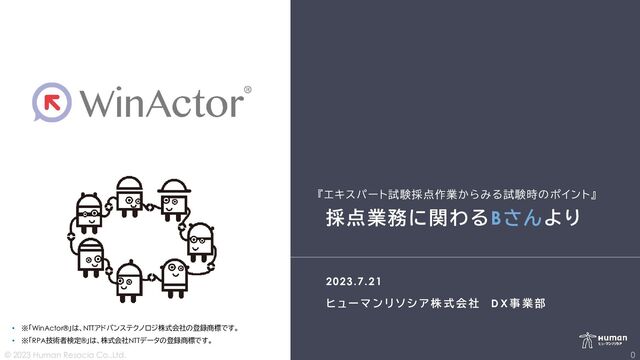 作 業 か ら み る 試 験 時 の ポ イ ン ト © 2023 Human Resocia Co.,Ltd. 17 04.試験時に効率良くシナリオ作成するための14のポイント ① WinActorのオプション・画面レイアウトの設定 ② 問題文・資材をしっかり確認 ③ シナリオ作成開始直後にシナリオ保存 ④ ファイルパスなどは変数一覧初期値に設定 ⑤ 設問毎にグループ化 ⑥ ライブラリの検索窓・更新を利用 ⑦ ノード・ライブリのコピー ⑧ メモ帳の利用 ⑨ 文字・値などのコピー&ペースト ⑩ 不要な設定はしない。 ⑪ 各種ショートカットキーの利用 ⑫ 細かく動作確認、シナリオ保存 ⑬ 最後にシナリオ実行して確認 ⑭ 最後まであきらめない