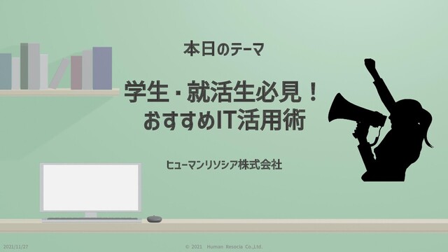 本日のテーマ 学生・就活生必見! おすすめIT活用術 ヒューマンリソシア株式会社 © 2021 Human Resocia Co.,Ltd. 2021/11/27