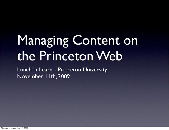 Such complex web sites publish and sustain every day vast amounts of time sensitive information. To manage the mountain of content, Princeton has turned to Content Management Systems that offer an integrated set of powerful features for creating, storing, versioning, and publishing everything from news articles and brochures though audio, video, and images.