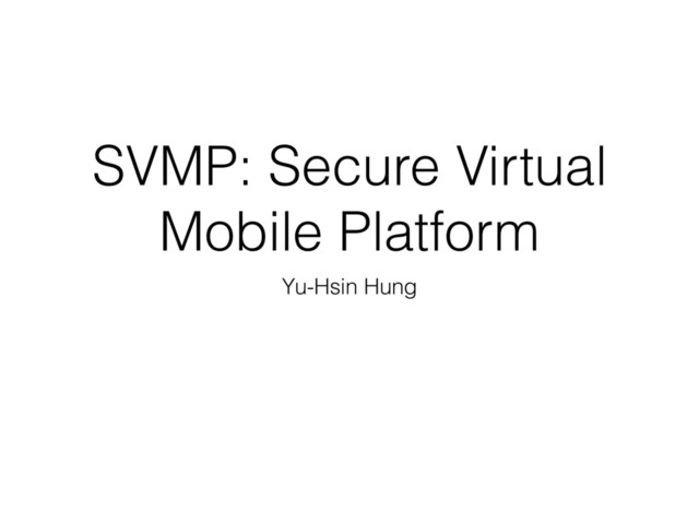 peer connection and SVMP protocol messages, similar to clients for VNC and RDP • SVMP Overseer: receive login request, perform authentication, and manage VMs on the cloud • SVMP Server: routing input message from client connections to SVMP daemons running inside virtual devices • SVMP daemon: primary entry point of client user input to the virtual device • Virtual Device: Virtual Device Image (SVMP Gold Image) + User Data Volume • Cloud Controller: support OpenStack, Amazon EC2…