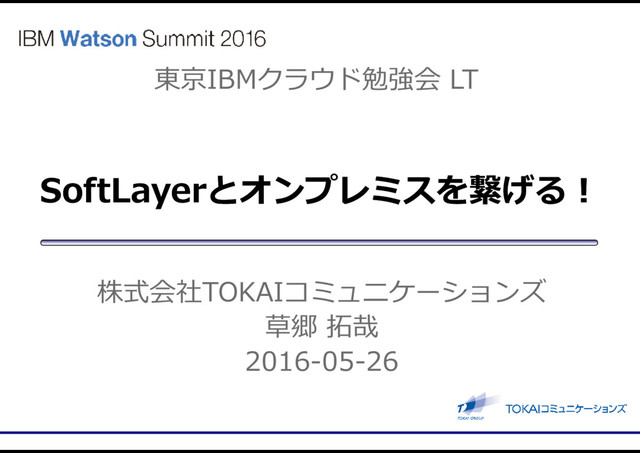 東京IBMクラウド勉強会 LT SoftLayerとオンプレミスを繋げる! SoftLayerとオンプレミスを繋げる! SoftLayerとオンプレミスを繋げる! SoftLayerとオンプレミスを繋げる! 株式会社TOKAIコミュニケーションズ 株式会社TOKAIコミュニケーションズ 草郷 拓哉