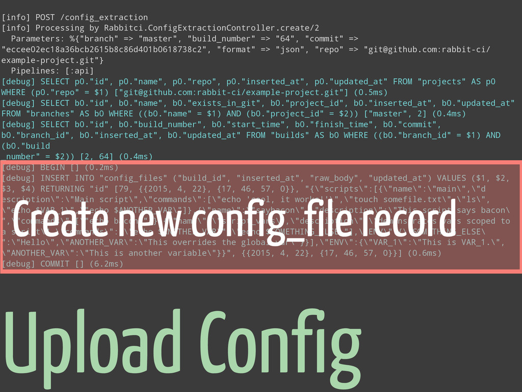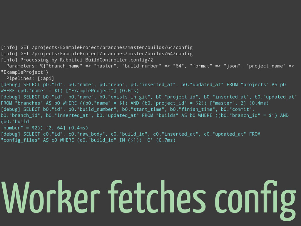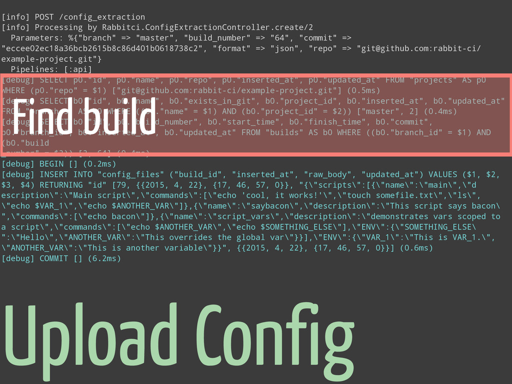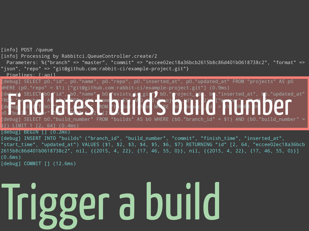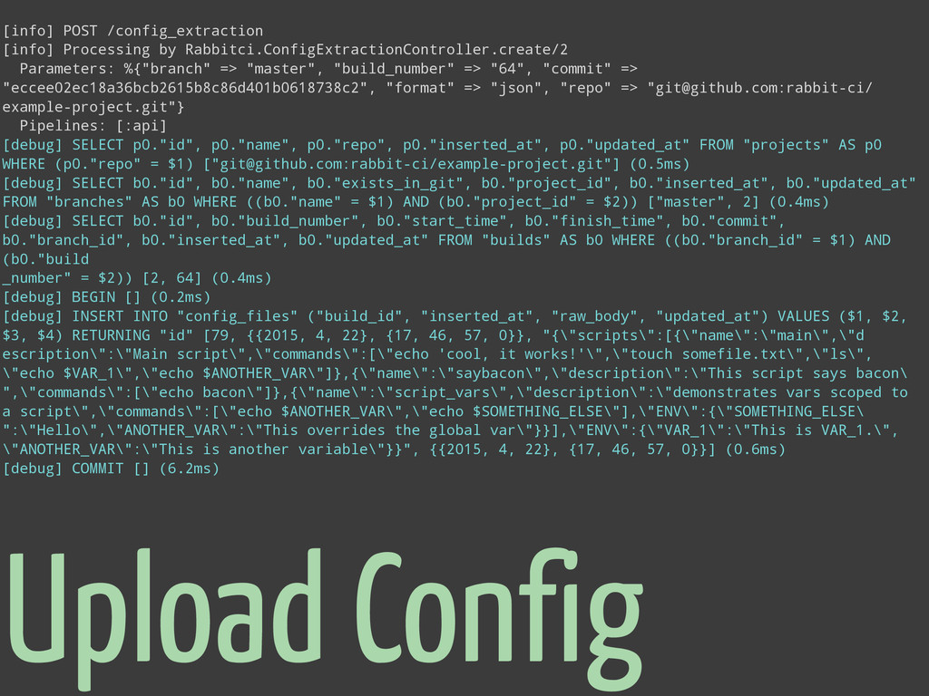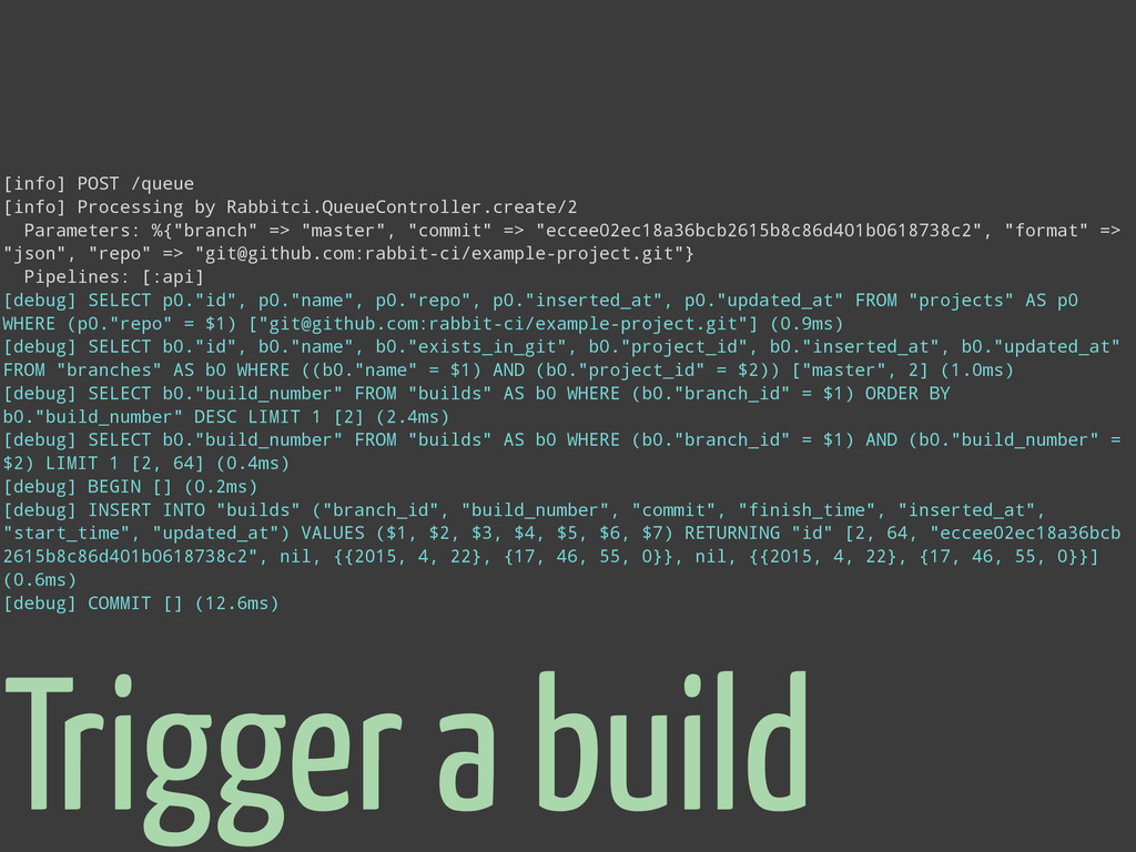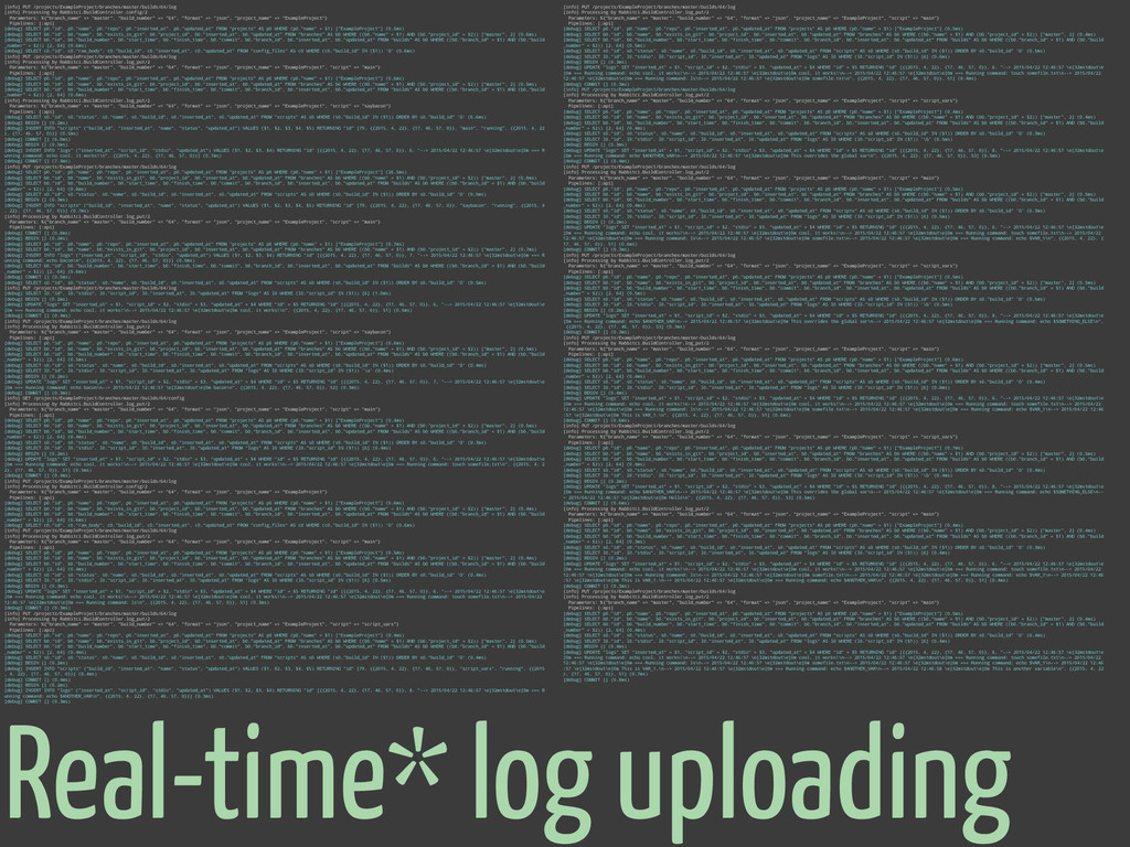 "master", "build_number" => "64", "format" => "json", "project_name" => "ExampleProject"} Pipelines: [:api] [debug] SELECT p0."id", p0."name", p0."repo", p0."inserted_at", p0."updated_at" FROM "projects" AS p0 WHERE (p0."name" = $1) ["ExampleProject"] (0.5ms) [debug] SELECT b0."id", b0."name", b0."exists_in_git", b0."project_id", b0."inserted_at", b0."updated_at" FROM "branches" AS b0 WHERE ((b0."name" = $1) AND (b0."project_id" = $2)) ["master", 2] (0.6ms) [debug] SELECT b0."id", b0."build_number", b0."start_time", b0."finish_time", b0."commit", b0."branch_id", b0."inserted_at", b0."updated_at" FROM "builds" AS b0 WHERE ((b0."branch_id" = $1) AND (b0."build _number" = $2)) [2, 64] (0.6ms) [debug] SELECT c0."id", c0."raw_body", c0."build_id", c0."inserted_at", c0."updated_at" FROM "config_files" AS c0 WHERE (c0."build_id" IN ($1)) 'O' (0.6ms) [info] PUT /projects/ExampleProject/branches/master/builds/64/log [info] Processing by Rabbitci.BuildController.log_put/2 Parameters: %{"branch_name" => "master", "build_number" => "64", "format" => "json", "project_name" => "ExampleProject", "script" => "main"} Pipelines: [:api] [debug] SELECT p0."id", p0."name", p0."repo", p0."inserted_at", p0."updated_at" FROM "projects" AS p0 WHERE (p0."name" = $1) ["ExampleProject"] (0.6ms) [debug] SELECT b0."id", b0."name", b0."exists_in_git", b0."project_id", b0."inserted_at", b0."updated_at" FROM "branches" AS b0 WHERE ((b0."name" = $1) AND (b0."project_id" = $2)) ["master", 2] (0.5ms) [debug] SELECT b0."id", b0."build_number", b0."start_time", b0."finish_time", b0."commit", b0."branch_id", b0."inserted_at", b0."updated_at" FROM "builds" AS b0 WHERE ((b0."branch_id" = $1) AND (b0."build _number" = $2)) [2, 64] (0.6ms) [info] Processing by Rabbitci.BuildController.log_put/2 Parameters: %{"branch_name" => "master", "build_number" => "64", "format" => "json", "project_name" => "ExampleProject", "script" => "saybacon"} Pipelines: [:api] [debug] SELECT s0."id", s0."status", s0."name", s0."build_id", s0."inserted_at", s0."updated_at" FROM "scripts" AS s0 WHERE (s0."build_id" IN ($1)) ORDER BY s0."build_id" 'O' (6.6ms) [debug] BEGIN [] (0.2ms) [debug] INSERT INTO "scripts" ("build_id", "inserted_at", "name", "status", "updated_at") VALUES ($1, $2, $3, $4, $5) RETURNING "id" [79, {{2015, 4, 22}, {17, 46, 57, 0}}, "main", "running", {{2015, 4, 22 }, {17, 46, 57, 0}}] (0.5ms) [debug] COMMIT [] (6.0ms) [debug] BEGIN [] (0.5ms) [debug] INSERT INTO "logs" ("inserted_at", "script_id", "stdio", "updated_at") VALUES ($1, $2, $3, $4) RETURNING "id" [{{2015, 4, 22}, {17, 46, 57, 0}}, 6, "--> 2015/04/22 12:46:57 \e[32mstdout\e[0m === R unning command: echo cool, it works!\n", {{2015, 4, 22}, {17, 46, 57, 0}}] (0.7ms) [debug] COMMIT [] (7.4ms) [info] PUT /projects/ExampleProject/branches/master/builds/64/log [debug] SELECT p0."id", p0."name", p0."repo", p0."inserted_at", p0."updated_at" FROM "projects" AS p0 WHERE (p0."name" = $1) ["ExampleProject"] (26.5ms) [debug] SELECT b0."id", b0."name", b0."exists_in_git", b0."project_id", b0."inserted_at", b0."updated_at" FROM "branches" AS b0 WHERE ((b0."name" = $1) AND (b0."project_id" = $2)) ["master", 2] (0.8ms) [debug] SELECT b0."id", b0."build_number", b0."start_time", b0."finish_time", b0."commit", b0."branch_id", b0."inserted_at", b0."updated_at" FROM "builds" AS b0 WHERE ((b0."branch_id" = $1) AND (b0."build _number" = $2)) [2, 64] (0.8ms) [debug] SELECT s0."id", s0."status", s0."name", s0."build_id", s0."inserted_at", s0."updated_at" FROM "scripts" AS s0 WHERE (s0."build_id" IN ($1)) ORDER BY s0."build_id" 'O' (0.9ms) [debug] BEGIN [] (0.3ms) [debug] INSERT INTO "scripts" ("build_id", "inserted_at", "name", "status", "updated_at") VALUES ($1, $2, $3, $4, $5) RETURNING "id" [79, {{2015, 4, 22}, {17, 46, 57, 0}}, "saybacon", "running", {{2015, 4 , 22}, {17, 46, 57, 0}}] (0.7ms) [info] Processing by Rabbitci.BuildController.log_put/2 Parameters: %{"branch_name" => "master", "build_number" => "64", "format" => "json", "project_name" => "ExampleProject", "script" => "main"} Pipelines: [:api] [debug] COMMIT [] (0.8ms) [debug] BEGIN [] (0.2ms) [debug] SELECT p0."id", p0."name", p0."repo", p0."inserted_at", p0."updated_at" FROM "projects" AS p0 WHERE (p0."name" = $1) ["ExampleProject"] (0.7ms) [debug] SELECT b0."id", b0."name", b0."exists_in_git", b0."project_id", b0."inserted_at", b0."updated_at" FROM "branches" AS b0 WHERE ((b0."name" = $1) AND (b0."project_id" = $2)) ["master", 2] (0.7ms) [debug] INSERT INTO "logs" ("inserted_at", "script_id", "stdio", "updated_at") VALUES ($1, $2, $3, $4) RETURNING "id" [{{2015, 4, 22}, {17, 46, 57, 0}}, 7, "--> 2015/04/22 12:46:57 \e[32mstdout\e[0m === R unning command: echo bacon\n", {{2015, 4, 22}, {17, 46, 57, 0}}] (0.9ms) [debug] SELECT b0."id", b0."build_number", b0."start_time", b0."finish_time", b0."commit", b0."branch_id", b0."inserted_at", b0."updated_at" FROM "builds" AS b0 WHERE ((b0."branch_id" = $1) AND (b0."build _number" = $2)) [2, 64] (0.6ms) [debug] COMMIT [] (0.5ms) [debug] SELECT s0."id", s0."status", s0."name", s0."build_id", s0."inserted_at", s0."updated_at" FROM "scripts" AS s0 WHERE (s0."build_id" IN ($1)) ORDER BY s0."build_id" 'O' (0.5ms) [info] PUT /projects/ExampleProject/branches/master/builds/64/log [debug] SELECT l0."id", l0."stdio", l0."script_id", l0."inserted_at", l0."updated_at" FROM "logs" AS l0 WHERE (l0."script_id" IN ($1)) [6] (1.0ms) [debug] BEGIN [] (0.2ms) [debug] UPDATE "logs" SET "inserted_at" = $1, "script_id" = $2, "stdio" = $3, "updated_at" = $4 WHERE "id" = $5 RETURNING "id" [{{2015, 4, 22}, {17, 46, 57, 0}}, 6, "--> 2015/04/22 12:46:57 \e[32mstdout\e [0m === Running command: echo cool, it works!\n--> 2015/04/22 12:46:57 \e[32mstdout\e[0m cool, it works!\n", {{2015, 4, 22}, {17, 46, 57, 0}}, 51] (0.5ms) [debug] COMMIT [] (0.4ms) [info] PUT /projects/ExampleProject/branches/master/builds/64/log [info] Processing by Rabbitci.BuildController.log_put/2 Parameters: %{"branch_name" => "master", "build_numbe
