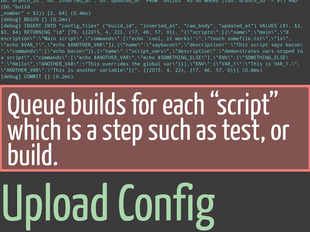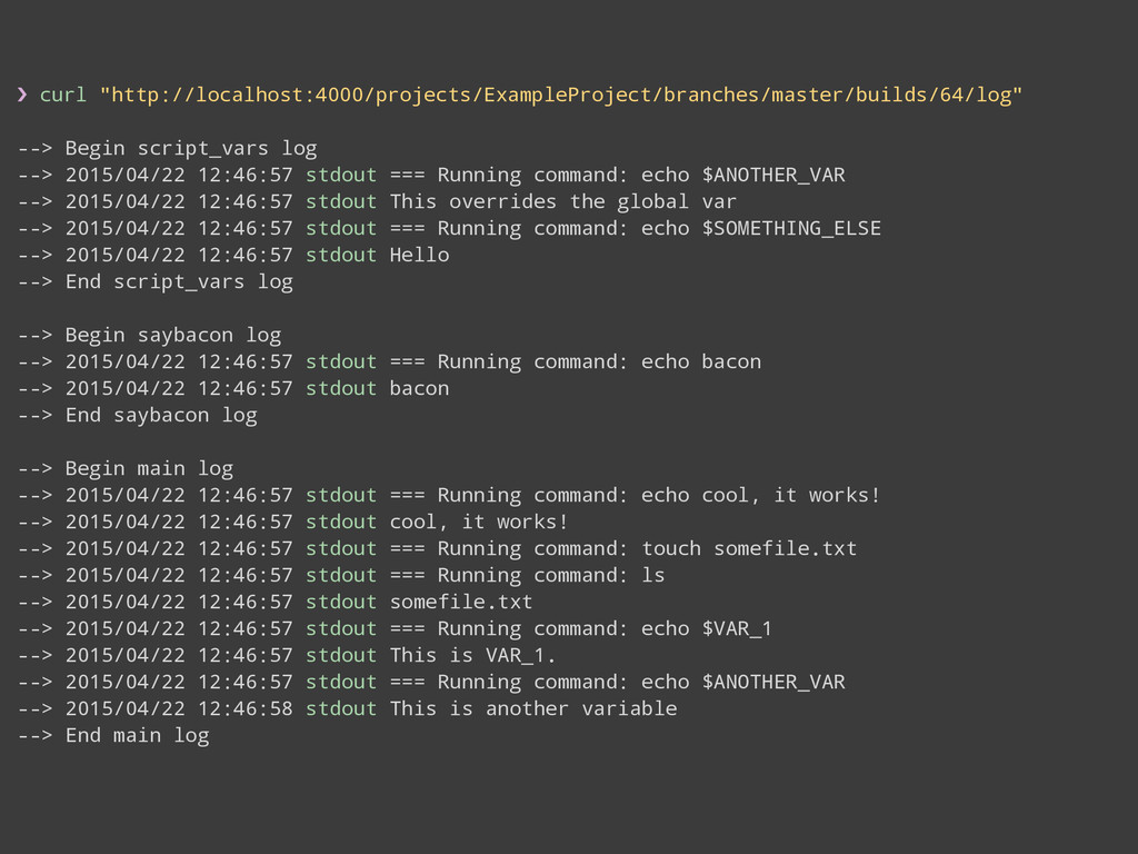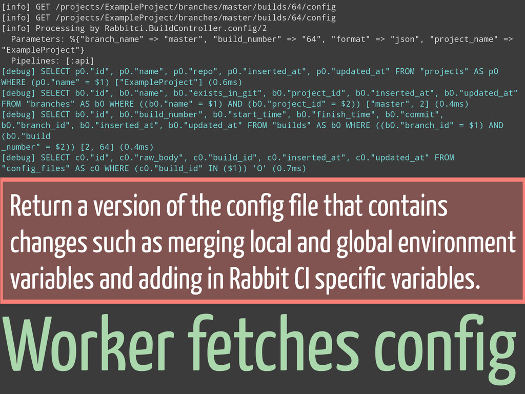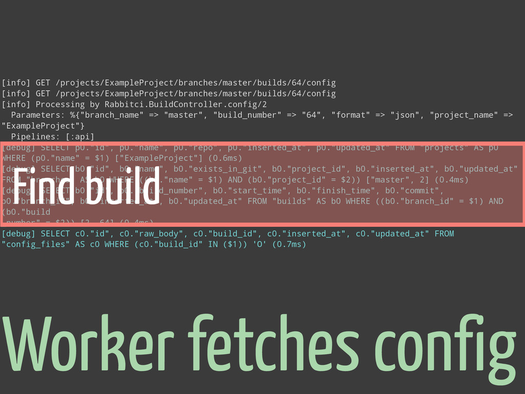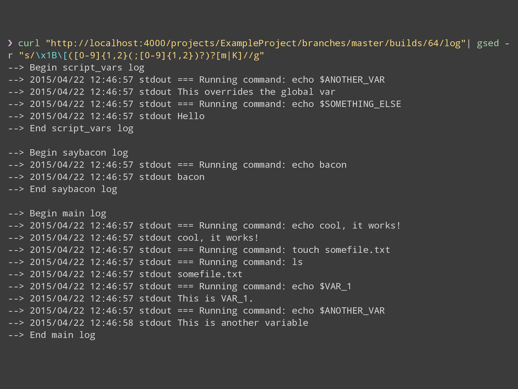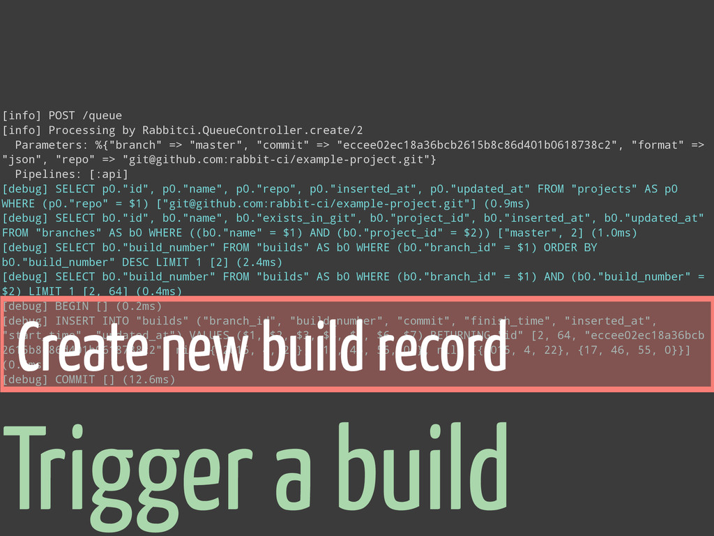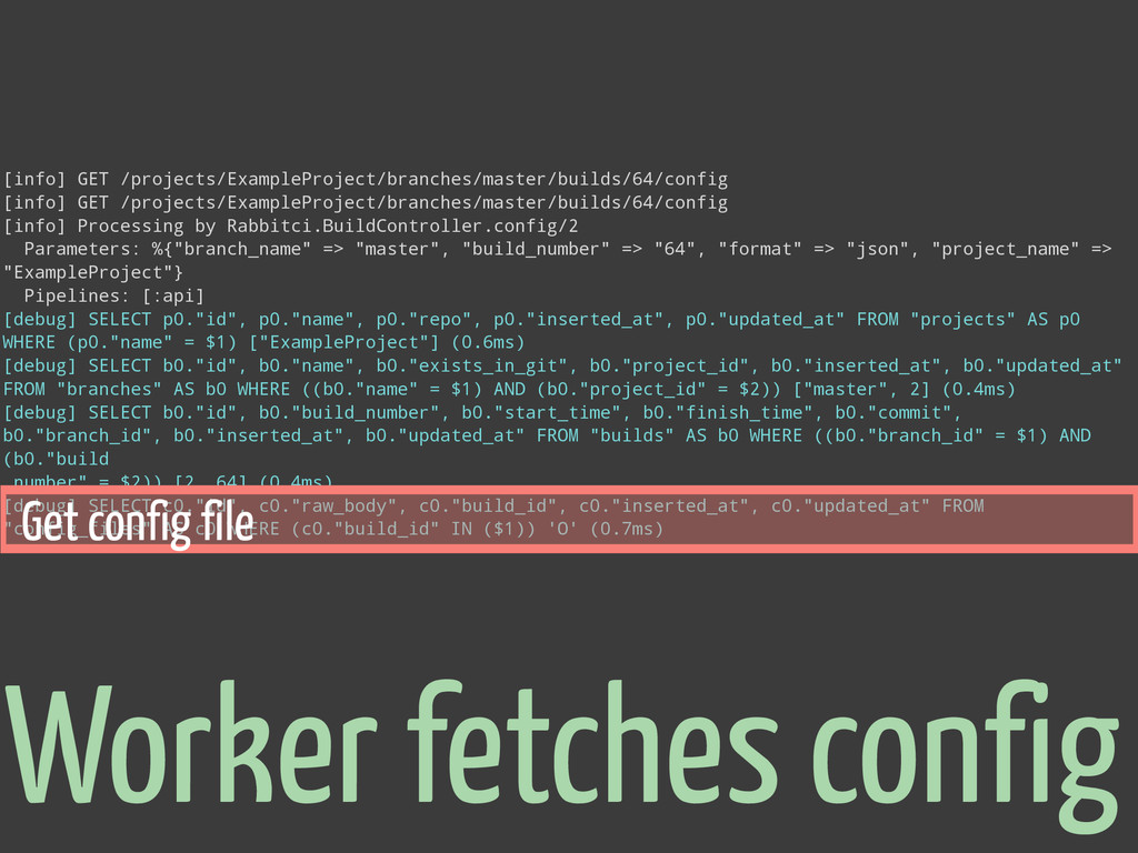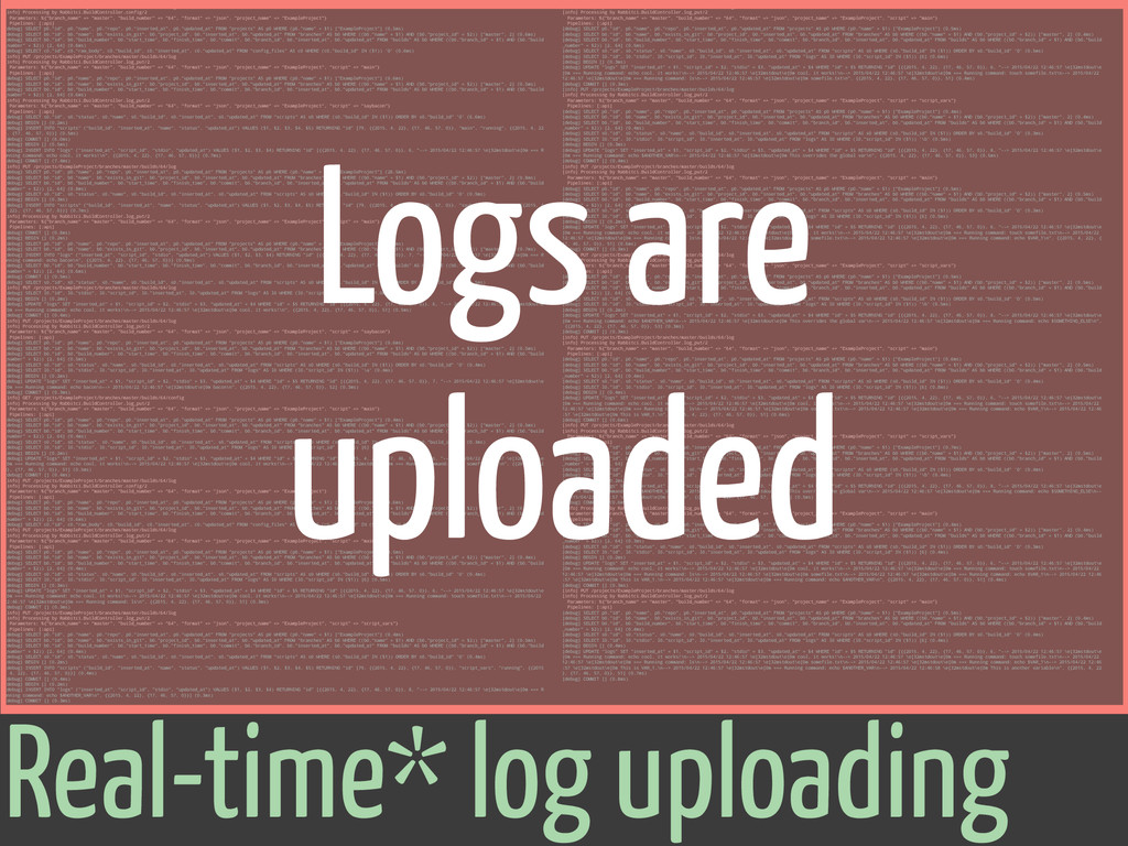 "master", "build_number" => "64", "format" => "json", "project_name" => "ExampleProject"} Pipelines: [:api] [debug] SELECT p0."id", p0."name", p0."repo", p0."inserted_at", p0."updated_at" FROM "projects" AS p0 WHERE (p0."name" = $1) ["ExampleProject"] (0.5ms) [debug] SELECT b0."id", b0."name", b0."exists_in_git", b0."project_id", b0."inserted_at", b0."updated_at" FROM "branches" AS b0 WHERE ((b0."name" = $1) AND (b0."project_id" = $2)) ["master", 2] (0.6ms) [debug] SELECT b0."id", b0."build_number", b0."start_time", b0."finish_time", b0."commit", b0."branch_id", b0."inserted_at", b0."updated_at" FROM "builds" AS b0 WHERE ((b0."branch_id" = $1) AND (b0."build _number" = $2)) [2, 64] (0.6ms) [debug] SELECT c0."id", c0."raw_body", c0."build_id", c0."inserted_at", c0."updated_at" FROM "config_files" AS c0 WHERE (c0."build_id" IN ($1)) 'O' (0.6ms) [info] PUT /projects/ExampleProject/branches/master/builds/64/log [info] Processing by Rabbitci.BuildController.log_put/2 Parameters: %{"branch_name" => "master", "build_number" => "64", "format" => "json", "project_name" => "ExampleProject", "script" => "main"} Pipelines: [:api] [debug] SELECT p0."id", p0."name", p0."repo", p0."inserted_at", p0."updated_at" FROM "projects" AS p0 WHERE (p0."name" = $1) ["ExampleProject"] (0.6ms) [debug] SELECT b0."id", b0."name", b0."exists_in_git", b0."project_id", b0."inserted_at", b0."updated_at" FROM "branches" AS b0 WHERE ((b0."name" = $1) AND (b0."project_id" = $2)) ["master", 2] (0.5ms) [debug] SELECT b0."id", b0."build_number", b0."start_time", b0."finish_time", b0."commit", b0."branch_id", b0."inserted_at", b0."updated_at" FROM "builds" AS b0 WHERE ((b0."branch_id" = $1) AND (b0."build _number" = $2)) [2, 64] (0.6ms) [info] Processing by Rabbitci.BuildController.log_put/2 Parameters: %{"branch_name" => "master", "build_number" => "64", "format" => "json", "project_name" => "ExampleProject", "script" => "saybacon"} Pipelines: [:api] [debug] SELECT s0."id", s0."status", s0."name", s0."build_id", s0."inserted_at", s0."updated_at" FROM "scripts" AS s0 WHERE (s0."build_id" IN ($1)) ORDER BY s0."build_id" 'O' (6.6ms) [debug] BEGIN [] (0.2ms) [debug] INSERT INTO "scripts" ("build_id", "inserted_at", "name", "status", "updated_at") VALUES ($1, $2, $3, $4, $5) RETURNING "id" [79, {{2015, 4, 22}, {17, 46, 57, 0}}, "main", "running", {{2015, 4, 22 }, {17, 46, 57, 0}}] (0.5ms) [debug] COMMIT [] (6.0ms) [debug] BEGIN [] (0.5ms) [debug] INSERT INTO "logs" ("inserted_at", "script_id", "stdio", "updated_at") VALUES ($1, $2, $3, $4) RETURNING "id" [{{2015, 4, 22}, {17, 46, 57, 0}}, 6, "--> 2015/04/22 12:46:57 \e[32mstdout\e[0m === R unning command: echo cool, it works!\n", {{2015, 4, 22}, {17, 46, 57, 0}}] (0.7ms) [debug] COMMIT [] (7.4ms) [info] PUT /projects/ExampleProject/branches/master/builds/64/log [debug] SELECT p0."id", p0."name", p0."repo", p0."inserted_at", p0."updated_at" FROM "projects" AS p0 WHERE (p0."name" = $1) ["ExampleProject"] (26.5ms) [debug] SELECT b0."id", b0."name", b0."exists_in_git", b0."project_id", b0."inserted_at", b0."updated_at" FROM "branches" AS b0 WHERE ((b0."name" = $1) AND (b0."project_id" = $2)) ["master", 2] (0.8ms) [debug] SELECT b0."id", b0."build_number", b0."start_time", b0."finish_time", b0."commit", b0."branch_id", b0."inserted_at", b0."updated_at" FROM "builds" AS b0 WHERE ((b0."branch_id" = $1) AND (b0."build _number" = $2)) [2, 64] (0.8ms) [debug] SELECT s0."id", s0."status", s0."name", s0."build_id", s0."inserted_at", s0."updated_at" FROM "scripts" AS s0 WHERE (s0."build_id" IN ($1)) ORDER BY s0."build_id" 'O' (0.9ms) [debug] BEGIN [] (0.3ms) [debug] INSERT INTO "scripts" ("build_id", "inserted_at", "name", "status", "updated_at") VALUES ($1, $2, $3, $4, $5) RETURNING "id" [79, {{2015, 4, 22}, {17, 46, 57, 0}}, "saybacon", "running", {{2015, 4 , 22}, {17, 46, 57, 0}}] (0.7ms) [info] Processing by Rabbitci.BuildController.log_put/2 Parameters: %{"branch_name" => "master", "build_number" => "64", "format" => "json", "project_name" => "ExampleProject", "script" => "main"} Pipelines: [:api] [debug] COMMIT [] (0.8ms) [debug] BEGIN [] (0.2ms) [debug] SELECT p0."id", p0."name", p0."repo", p0."inserted_at", p0."updated_at" FROM "projects" AS p0 WHERE (p0."name" = $1) ["ExampleProject"] (0.7ms) [debug] SELECT b0."id", b0."name", b0."exists_in_git", b0."project_id", b0."inserted_at", b0."updated_at" FROM "branches" AS b0 WHERE ((b0."name" = $1) AND (b0."project_id" = $2)) ["master", 2] (0.7ms) [debug] INSERT INTO "logs" ("inserted_at", "script_id", "stdio", "updated_at") VALUES ($1, $2, $3, $4) RETURNING "id" [{{2015, 4, 22}, {17, 46, 57, 0}}, 7, "--> 2015/04/22 12:46:57 \e[32mstdout\e[0m === R unning command: echo bacon\n", {{2015, 4, 22}, {17, 46, 57, 0}}] (0.9ms) [debug] SELECT b0."id", b0."build_number", b0."start_time", b0."finish_time", b0."commit", b0."branch_id", b0."inserted_at", b0."updated_at" FROM "builds" AS b0 WHERE ((b0."branch_id" = $1) AND (b0."build _number" = $2)) [2, 64] (0.6ms) [debug] COMMIT [] (0.5ms) [debug] SELECT s0."id", s0."status", s0."name", s0."build_id", s0."inserted_at", s0."updated_at" FROM "scripts" AS s0 WHERE (s0."build_id" IN ($1)) ORDER BY s0."build_id" 'O' (0.5ms) [info] PUT /projects/ExampleProject/branches/master/builds/64/log [debug] SELECT l0."id", l0."stdio", l0."script_id", l0."inserted_at", l0."updated_at" FROM "logs" AS l0 WHERE (l0."script_id" IN ($1)) [6] (1.0ms) [debug] BEGIN [] (0.2ms) [debug] UPDATE "logs" SET "inserted_at" = $1, "script_id" = $2, "stdio" = $3, "updated_at" = $4 WHERE "id" = $5 RETURNING "id" [{{2015, 4, 22}, {17, 46, 57, 0}}, 6, "--> 2015/04/22 12:46:57 \e[32mstdout\e [0m === Running command: echo cool, it works!\n--> 2015/04/22 12:46:57 \e[32mstdout\e[0m cool, it works!\n", {{2015, 4, 22}, {17, 46, 57, 0}}, 51] (0.5ms) [debug] COMMIT [] (0.4ms) [info] PUT /projects/ExampleProject/branches/master/builds/64/log [info] Processing by Rabbitci.BuildController.log_put/2 Parameters: %{"branch_name" => "master", "build_numbe
