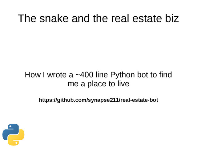 https://github.com/synapse211/real-estate-bot My solution • Let's write a bot that scrapes the RE site(s) • Do this every hour, send changes in email • Agents usually work normal hours, so that's way before 6am the next day I should win as I have information much quicker than anyone else