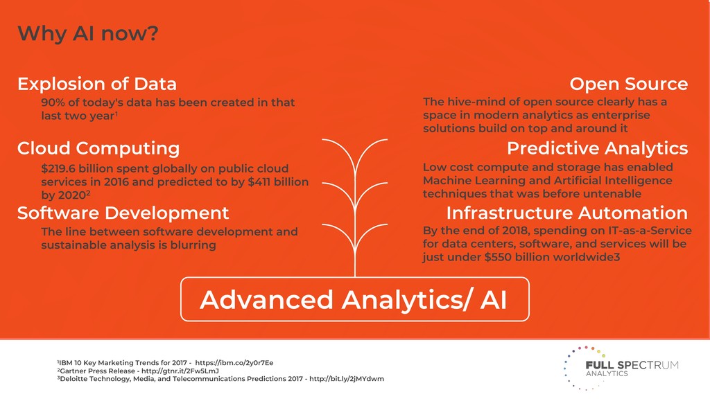 Computing Software Development Predictive Analytics Open Source Infrastructure Automation 90% of today's data has been created in that last two year1 $219.6 billion spent globally on public cloud services in 2016 and predicted to by $411 billion by 20202 The line between software development and sustainable analysis is blurring The hive-mind of open source clearly has a space in modern analytics as enterprise solutions build on top and around it Low cost compute and storage has enabled Machine Learning and Artificial Intelligence techniques that was before untenable By the end of 2018, spending on IT-as-a-Service for data centers, software, and services will be just under $550 billion worldwide3 1IBM 10 Key Marketing Trends for 2017 - https://ibm.co/2y0r7Ee 2Gartner Press Release - http://gtnr.it/2Fw5LmJ 3Deloitte Technology, Media, and Telecommunications Predictions 2017 - http://bit.ly/2jMYdwm