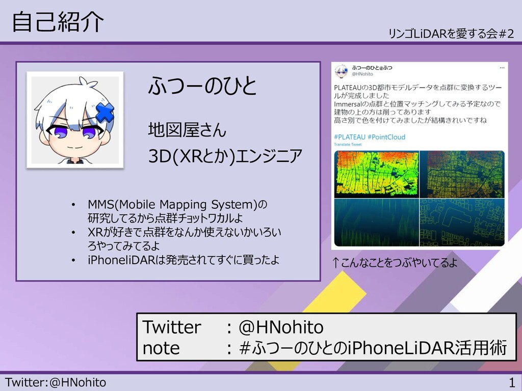 自己紹介 Twitter:@HNohito 1 リンゴLiDARを愛する会#2 Twitter :@HNohito note :#ふつーのひとのiPhoneLiDAR活用術 ふつーのひと 3D(XRとか)エンジニア