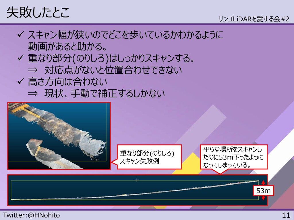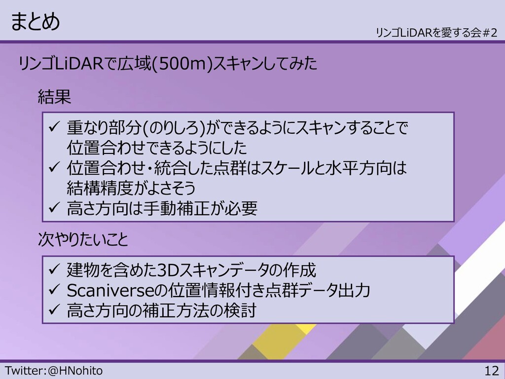 ⇒ 現状、手動で補正するしかない Twitter:@HNohito 11 リンゴLiDARを愛する会#2 53m 重なり部分(のりしろ) スキャン失敗例 平らな場所をスキャンし たのに53m下ったように なってしまっている。