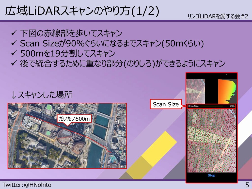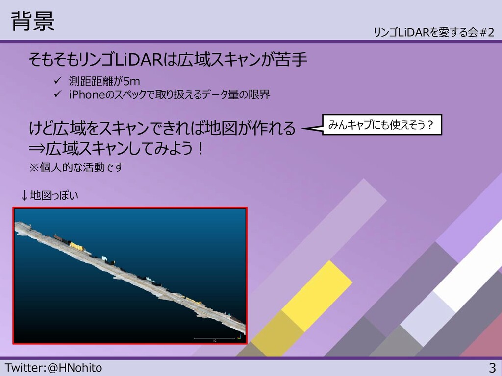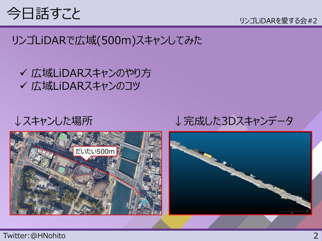 今日話すこと リンゴLiDARで広域(500m)スキャンしてみた Twitter:@HNohito 2 リンゴLiDARを愛する会#2 広域LiDARスキャンのやり方 広域LiDARスキャンのコツ ↓スキャンした場所