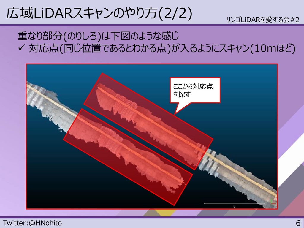 広域LiDARスキャンのやり方(2/2) 重なり部分(のりしろ)は下図のような感じ 対応点(同じ位置であるとわかる点)が入るようにスキャン(10mほど) Twitter:@HNohito 6 リンゴLiDARを愛する会#2 ここから対応点 を探す