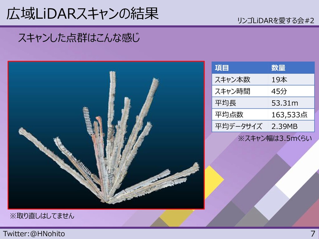 広域LiDARスキャンの結果 スキャンした点群はこんな感じ Twitter:@HNohito 7 リンゴLiDARを愛する会#2 項目 数量 スキャン本数 19本 スキャン時間