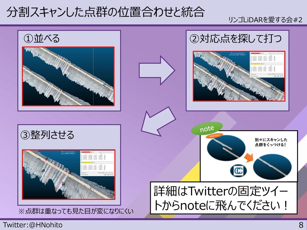 分割スキャンした点群の位置合わせと統合 Twitter:@HNohito 8 リンゴLiDARを愛する会#2 詳細はTwitterの固定ツイー トからnoteに飛んでください! ①並べる ※点群は重なっても見た目が変になりにくい ②対応点を探して打つ ③整列させる