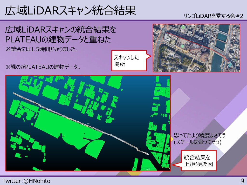 広域LiDARスキャン統合結果 広域LiDARスキャンの統合結果を PLATEAUの建物データと重ねた Twitter:@HNohito 9 リンゴLiDARを愛する会#2 思ってたより精度よさそう (スケールは合ってそう) スキャンした 場所