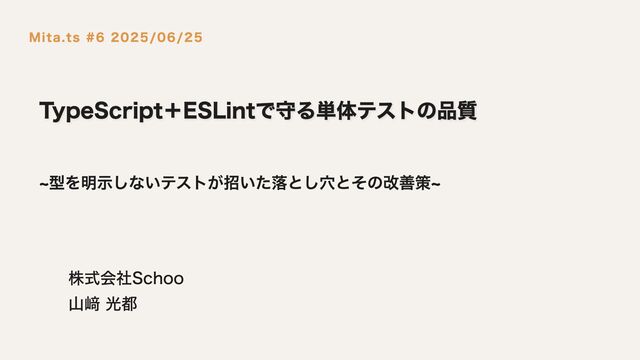 mockUser: User = { // 明示的な型指定 userId: "user1", name: "テストユーザー", organization: { id: 'org456', name: 'Schoo', }, }; const mockRepository: IUserRepository = { getUser: vi. fn(). mockResolvedValue(mockUser), }; // テスト実行 const result: User = await userService. getUser(mockRepository, mockContext); // 検証 expect(result). toEqual({ ...mockUser, }); }); interface変更時にテストでエラーが発生し、修正漏れを防げる