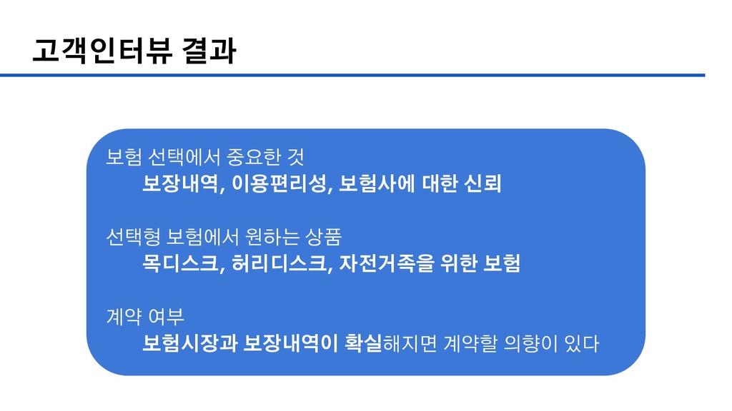 고객인터뷰 결과 보험 선택에서 중요한 것 보장내역, 이용편리성, 보험사에 대한