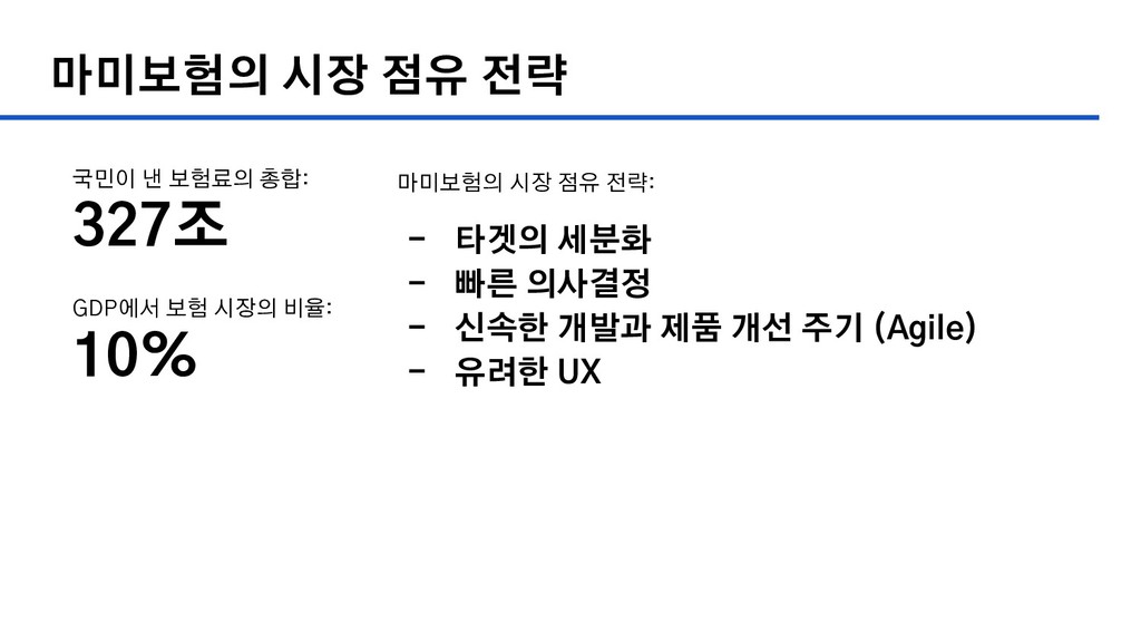 보험 시장의 비율: 10% 마미보험의 시장 점유 전략: - 타겟의 세분화 - 빠른 의사결정 - 신속한 개발과 제품 개선 주기 (Agile) - 유려한 UX