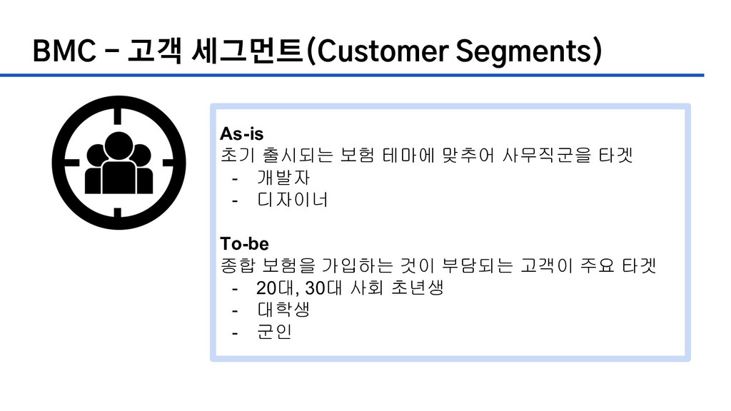 BMC - 고객 세그먼트(Customer Segments) As-is 초기 출시되는 보험 테마에
