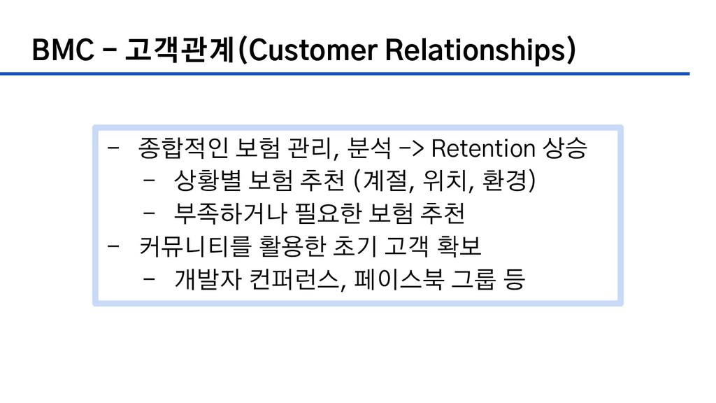 Retention 상승 - 상황별 보험 추천 (계절, 위치, 환경) - 부족하거나 필요한 보험 추천 - 커뮤니티를 활용한 초기 고객 확보 - 개발자 컨퍼런스, 페이스북 그룹 등