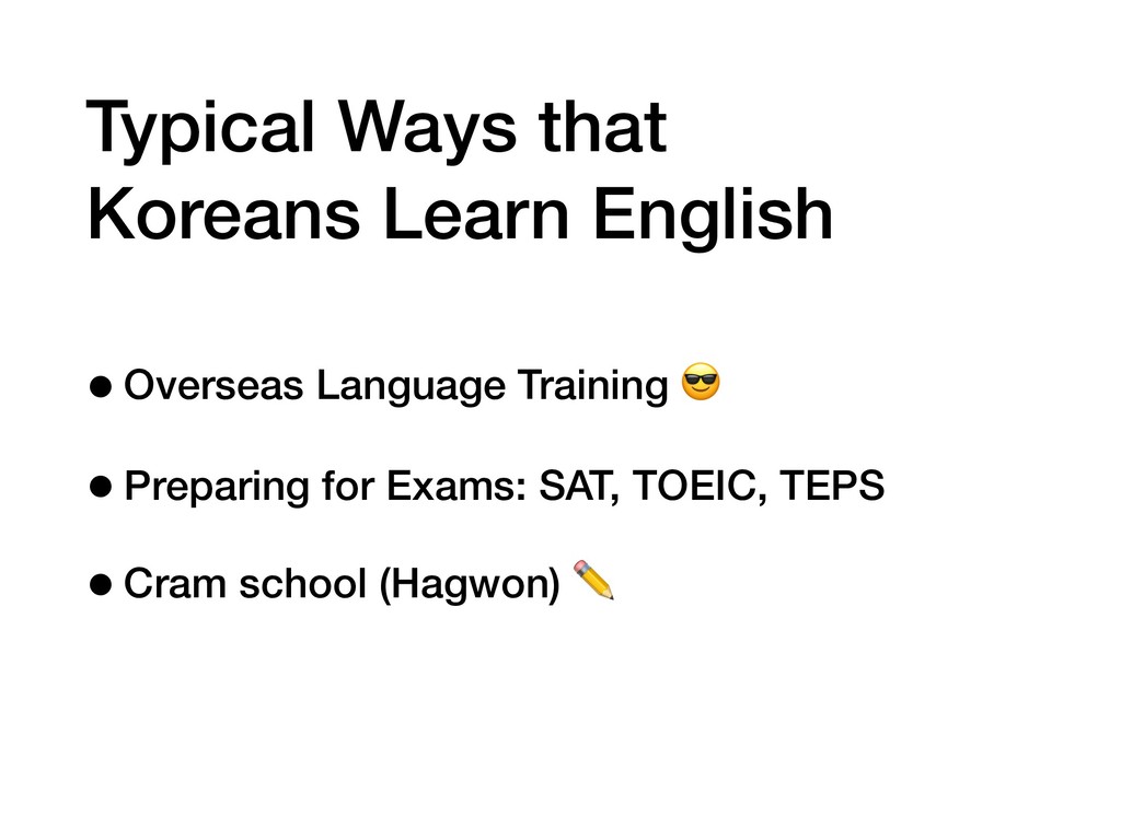 Typical Ways that Koreans Learn English •Overseas Language Training •Preparing