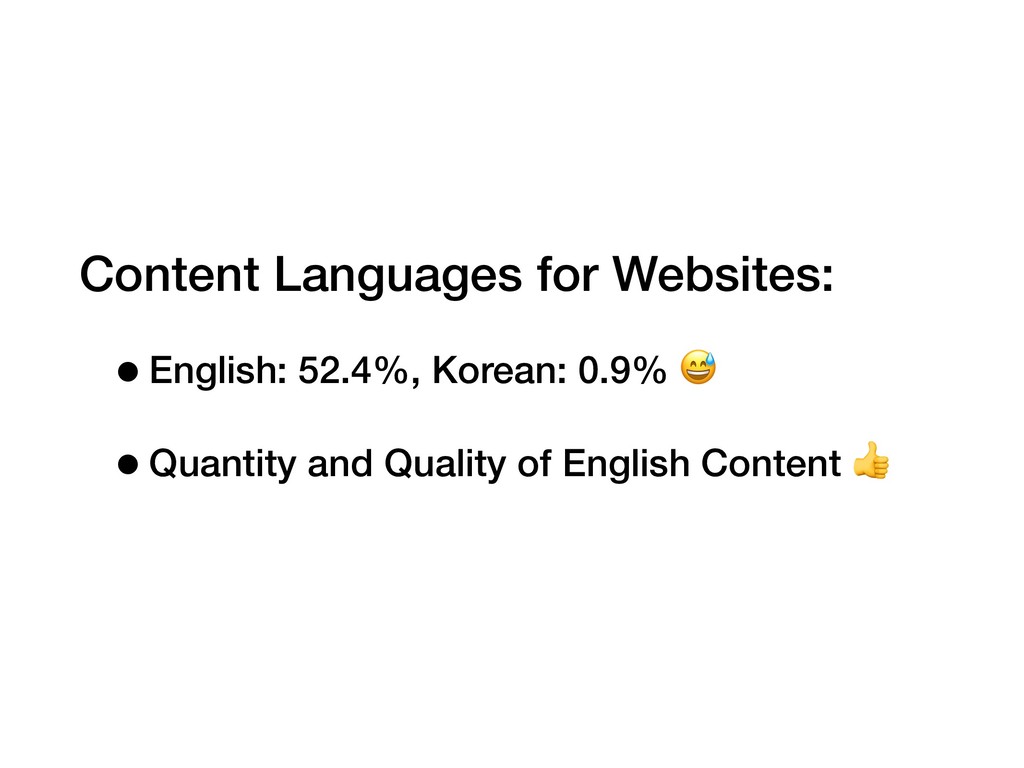 Content Languages for Websites: •English: 52.4%, Korean: 0.9% •Quantity and