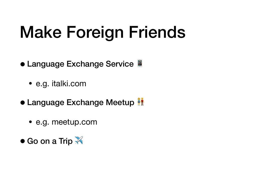Make Foreign Friends •Language Exchange Service • e.g. italki.com •Language