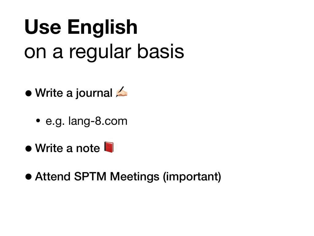 • e.g. lang-8.com •Write a note •Attend SPTM Meetings (important)