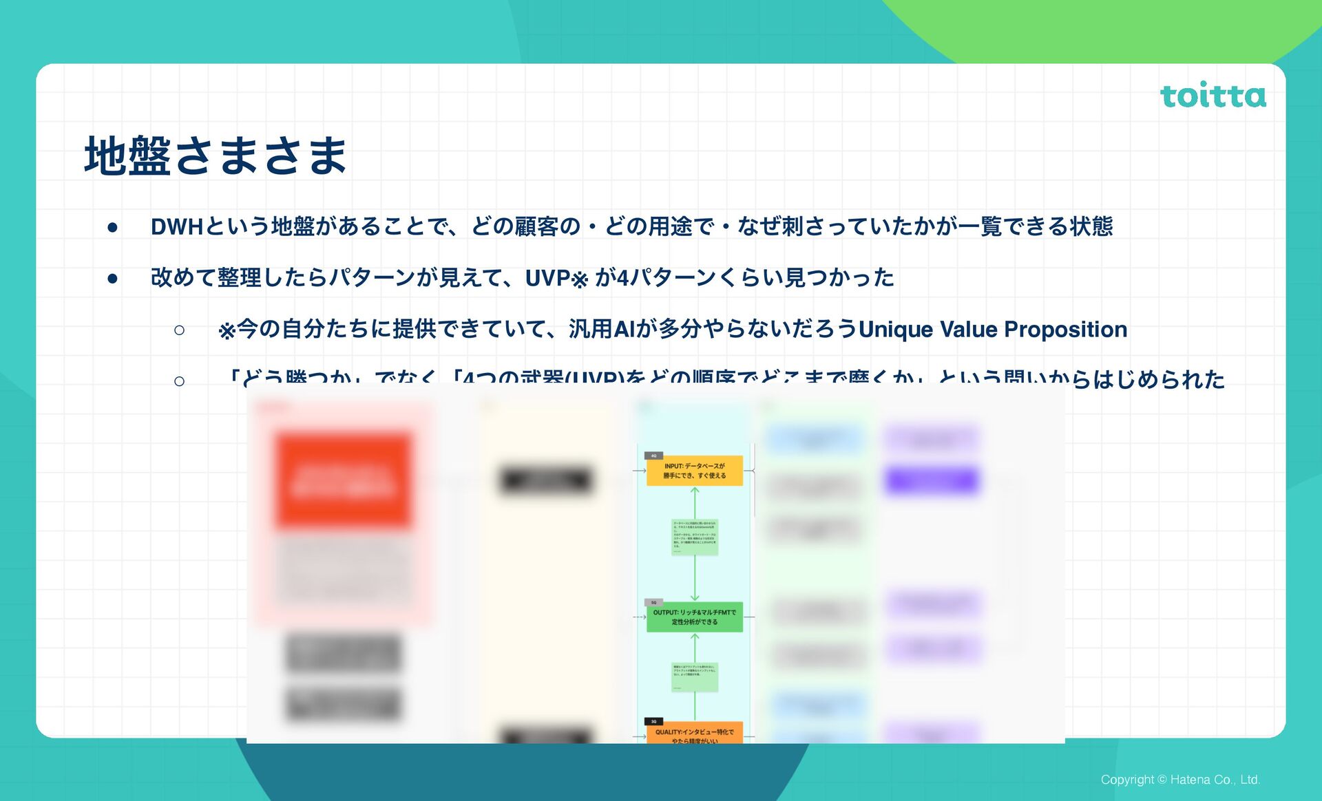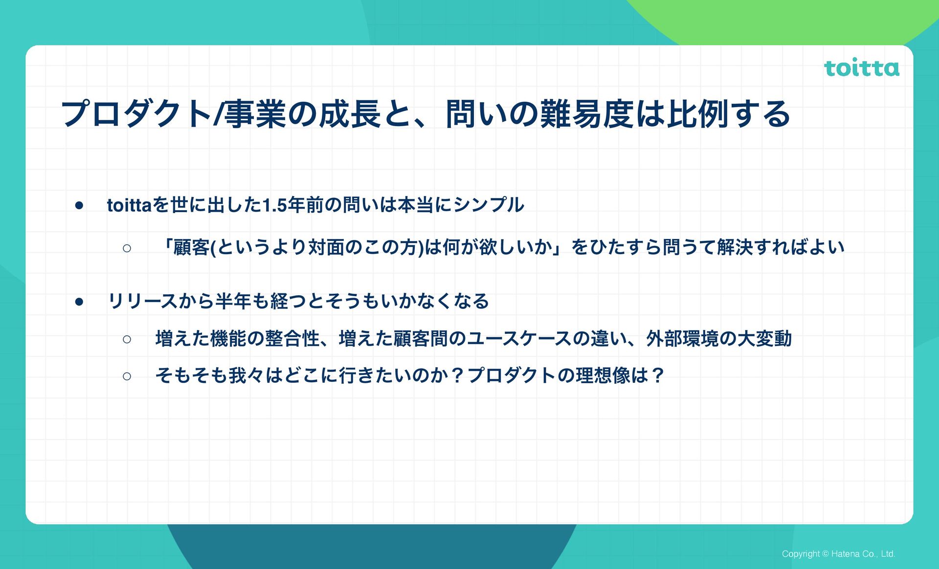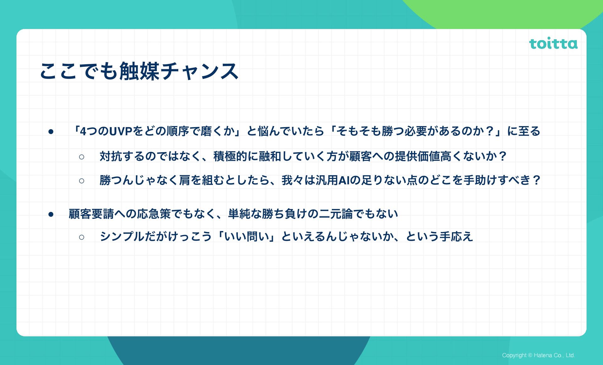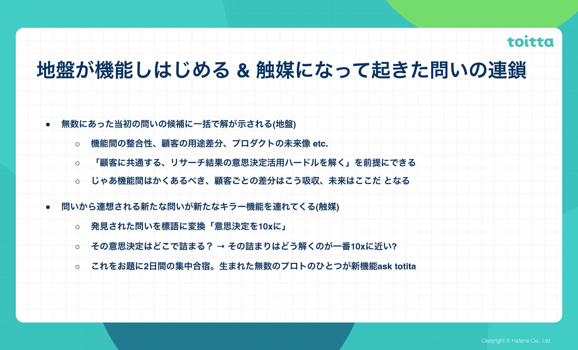 ◦ ػೳؒͷ߹ੑɺސ٬ͷ༻్ࠩɺϓϩμΫτͷະདྷ૾ etc. ◦ ʮސ٬ʹڞ௨͢ΔɺϦαʔν݁Ռͷҙࢥܾఆ׆༻ϋʔυϧΛղ͘ʯΛલఏʹͰ͖Δ ◦ ͡Ό͋ػೳ͔ؒ͋͘Δ͖ɺސ٬͝ͱͷࠩ͜͏ٵऩɺະདྷͩ͜͜ ͱͳΔ • ͍͔Β࿈͞ΕΔ৽ͨͳ͍͕৽ͨͳΩϥʔػೳΛ࿈Εͯ͘Δ(৮ഔ) ◦ ൃݟ͞Ε͍ͨΛඪޠʹมʮҙࢥܾఆΛ10xʹʯ ◦ ͦͷҙࢥܾఆͲ͜Ͱ٧·Δʁ → ͦͷ٧·ΓͲ͏ղ͘ͷ͕Ұ൪10xʹ͍ۙ? ◦ ͜ΕΛ͓ʹ2ؒͷूத߹॓ɻੜ·Εͨແͷϓϩτͷͻͱ͕ͭ৽ػೳask totita