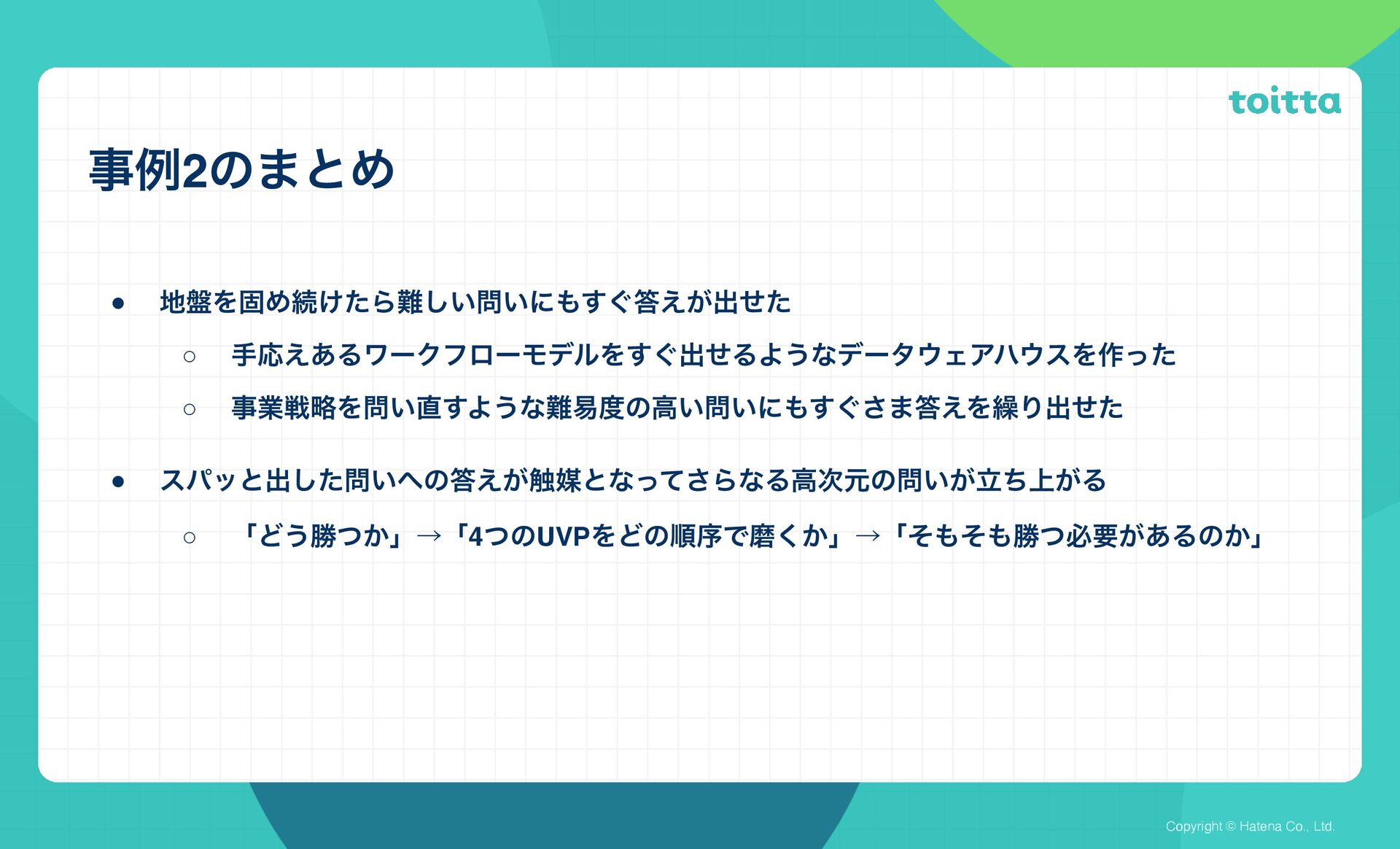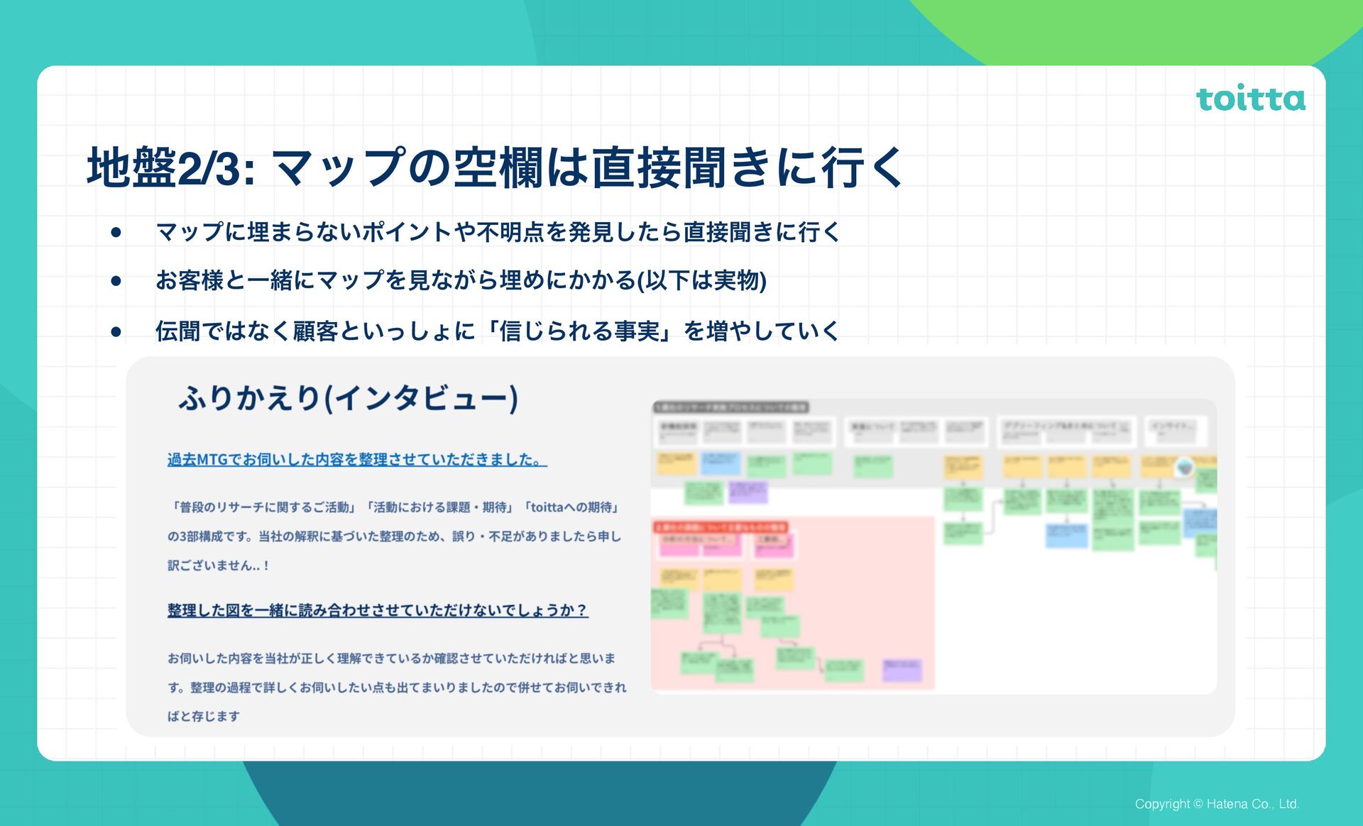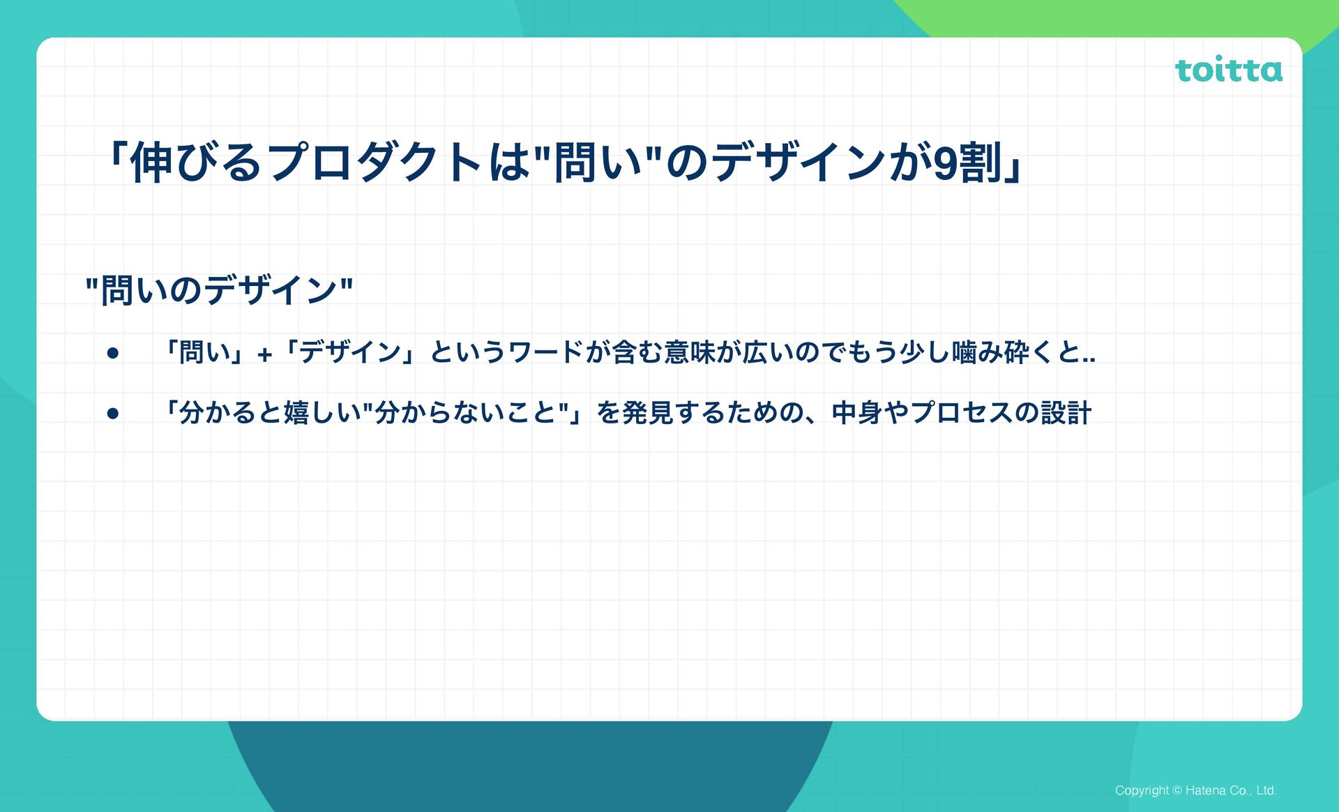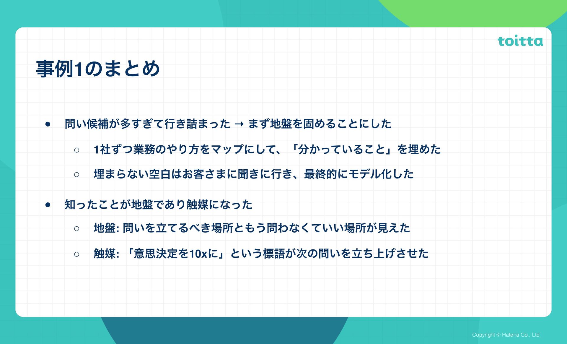 ◦ ػೳؒͷ߹ੑɺސ٬ͷ༻్ࠩɺϓϩμΫτͷະདྷ૾ etc. ◦ ʮސ٬ʹڞ௨͢ΔɺϦαʔν݁Ռͷҙࢥܾఆ׆༻ϋʔυϧΛղ͘ʯΛલఏʹͰ͖Δ ◦ ͡Ό͋ػೳ͔ؒ͋͘Δ͖ɺސ٬͝ͱͷࠩ͜͏ٵऩɺະདྷͩ͜͜ ͱͳΔ • ͍͔Β࿈͞ΕΔ৽ͨͳ͍͕৽ͨͳΩϥʔػೳΛ࿈Εͯ͘Δ(৮ഔ) ◦ ൃݟ͞Ε͍ͨΛඪޠʹมʮҙࢥܾఆΛ10xʹʯ ◦ ͦͷҙࢥܾఆͲ͜Ͱ٧·Δʁ → ͦͷ٧·ΓͲ͏ղ͘ͷ͕Ұ൪10xʹ͍ۙ? ◦ ͜ΕΛ͓ʹ2ؒͷूத߹॓ɻੜ·Εͨແͷϓϩτͷͻͱ͕ͭ৽ػೳask totita