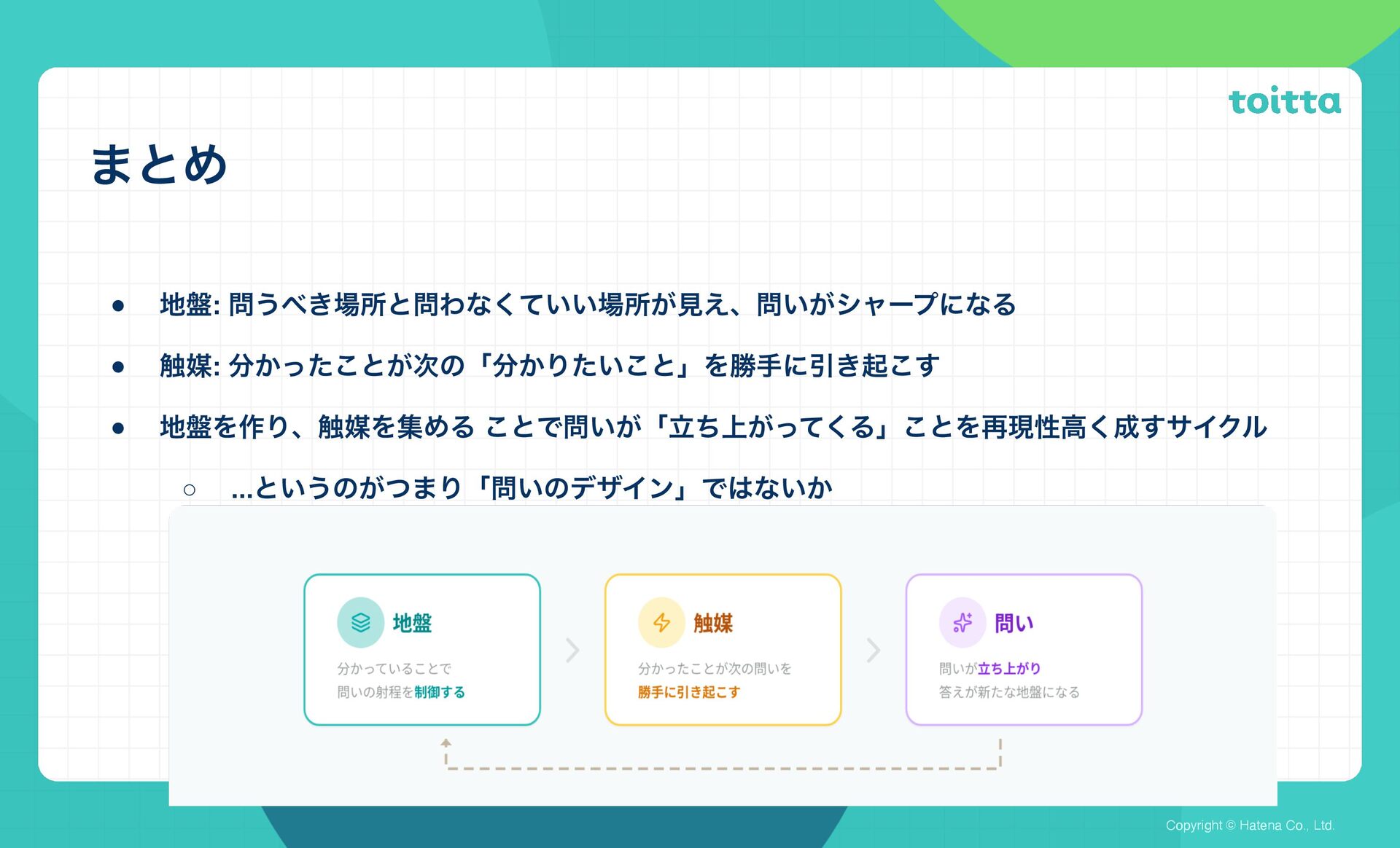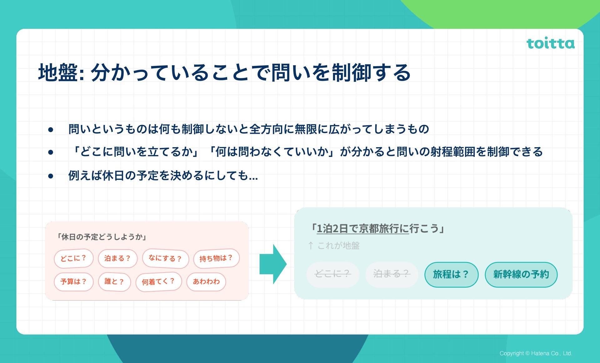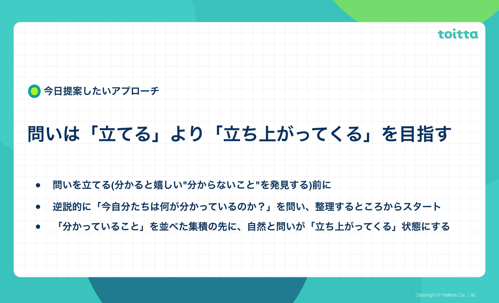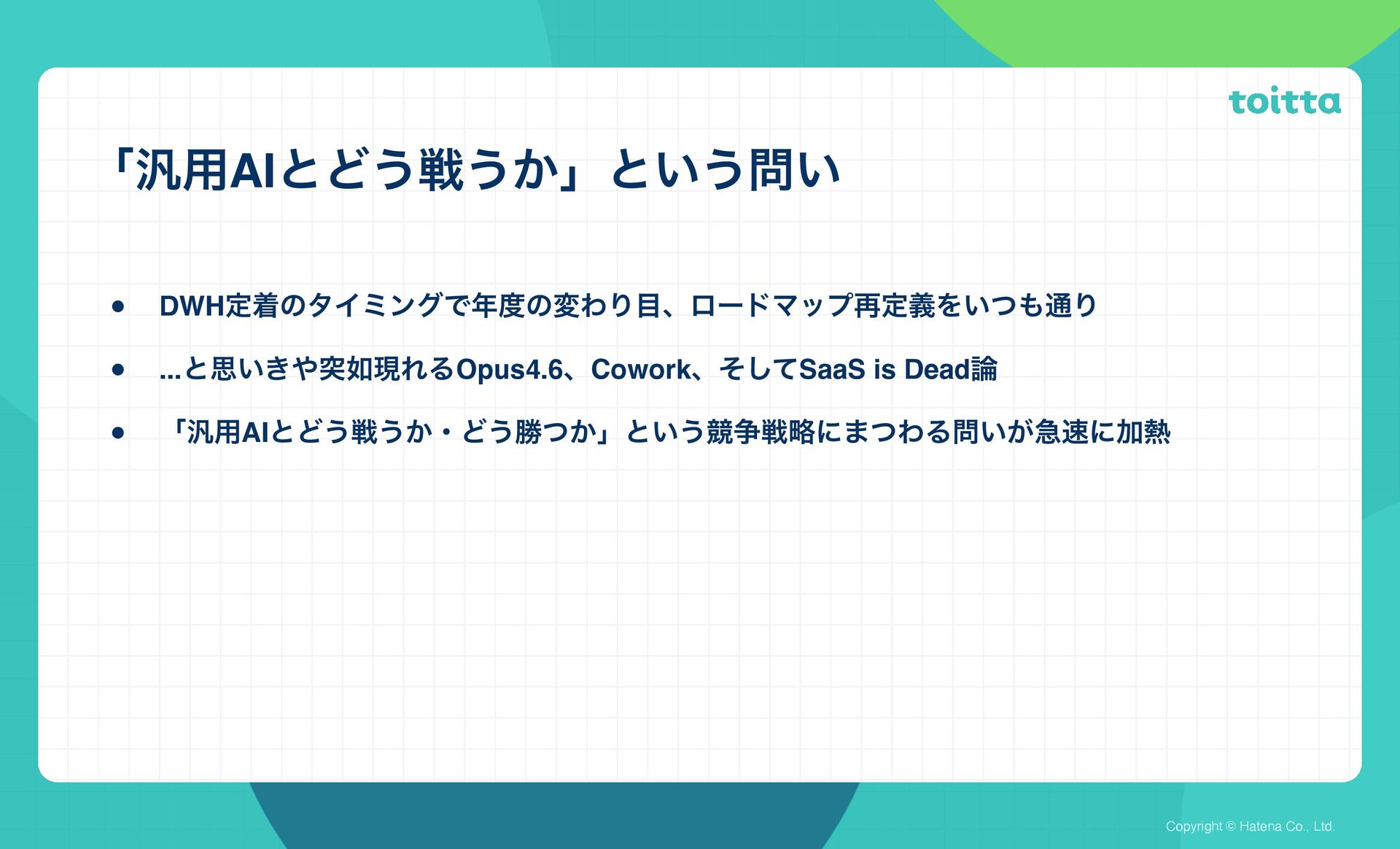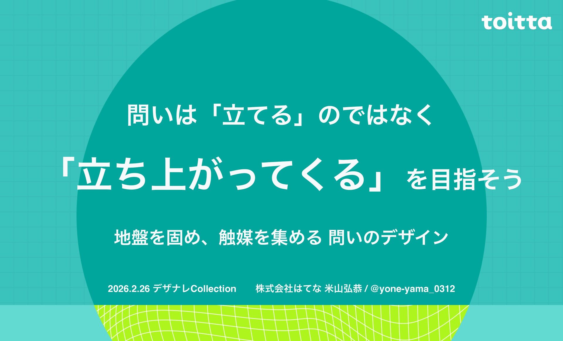 ◦ ػೳؒͷ߹ੑɺސ٬ͷ༻్ࠩɺϓϩμΫτͷະདྷ૾ etc. ◦ ʮސ٬ʹڞ௨͢ΔɺϦαʔν݁Ռͷҙࢥܾఆ׆༻ϋʔυϧΛղ͘ʯΛલఏʹͰ͖Δ ◦ ͡Ό͋ػೳ͔ؒ͋͘Δ͖ɺސ٬͝ͱͷࠩ͜͏ٵऩɺະདྷͩ͜͜ ͱͳΔ • ͍͔Β࿈͞ΕΔ৽ͨͳ͍͕৽ͨͳΩϥʔػೳΛ࿈Εͯ͘Δ(৮ഔ) ◦ ൃݟ͞Ε͍ͨΛඪޠʹมʮҙࢥܾఆΛ10xʹʯ ◦ ͦͷҙࢥܾఆͲ͜Ͱ٧·Δʁ → ͦͷ٧·ΓͲ͏ղ͘ͷ͕Ұ൪10xʹ͍ۙ? ◦ ͜ΕΛ͓ʹ2ؒͷूத߹॓ɻੜ·Εͨແͷϓϩτͷͻͱ͕ͭ৽ػೳask totita