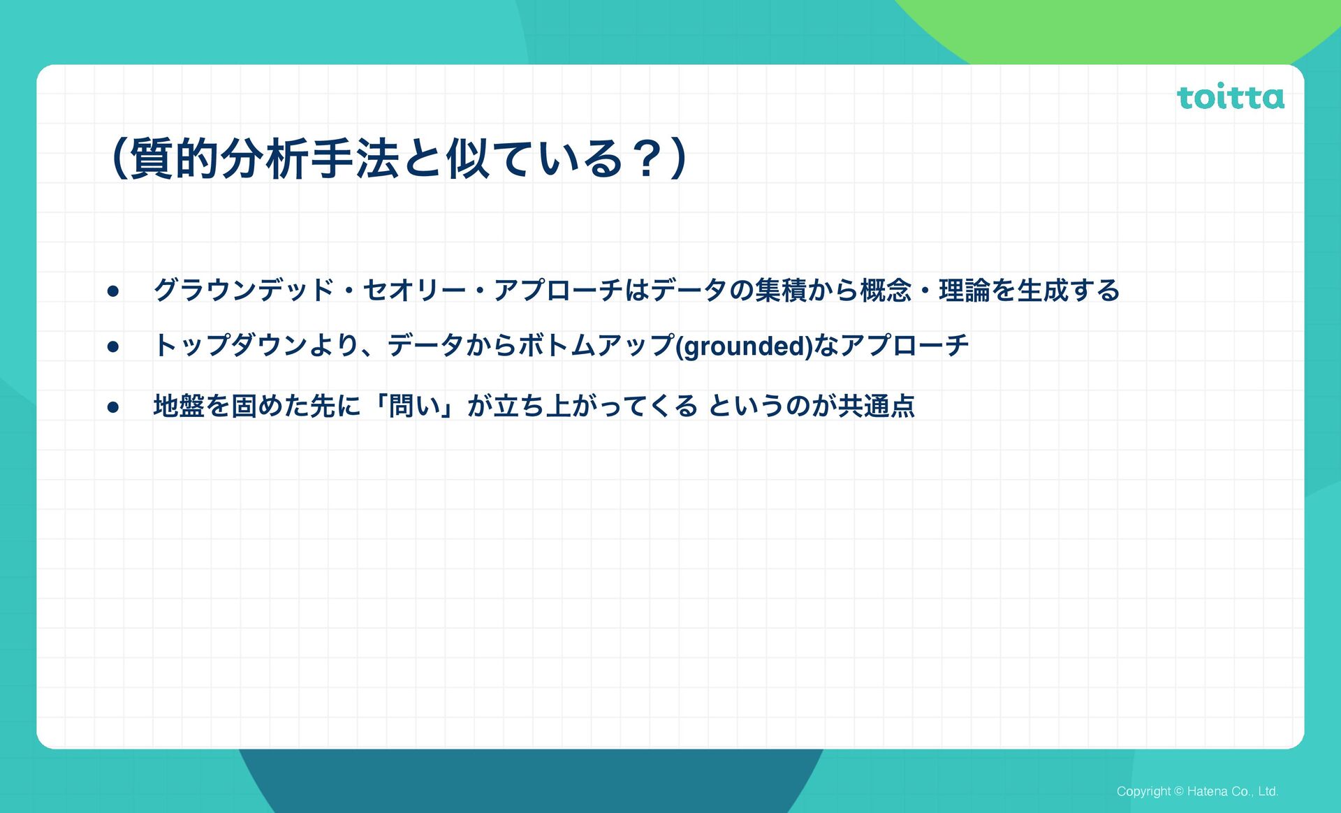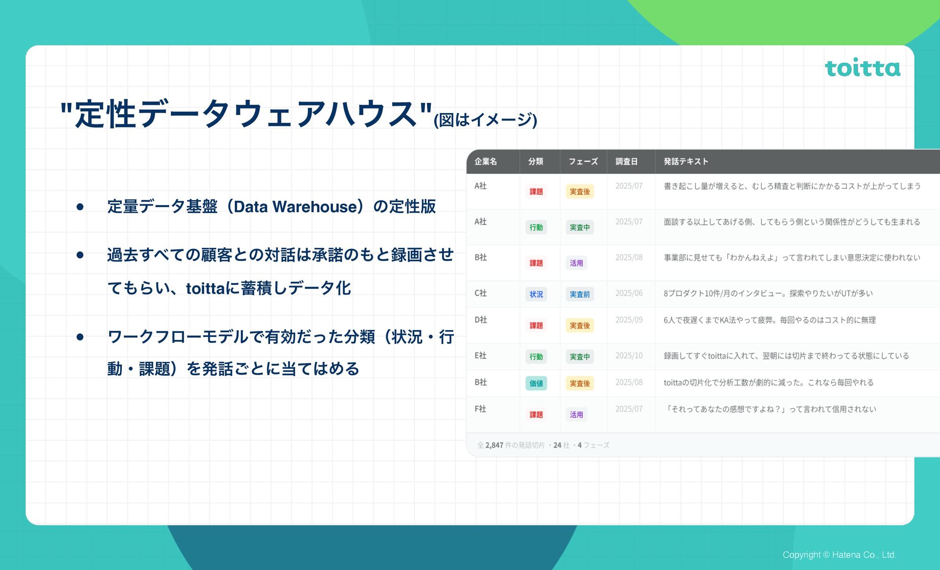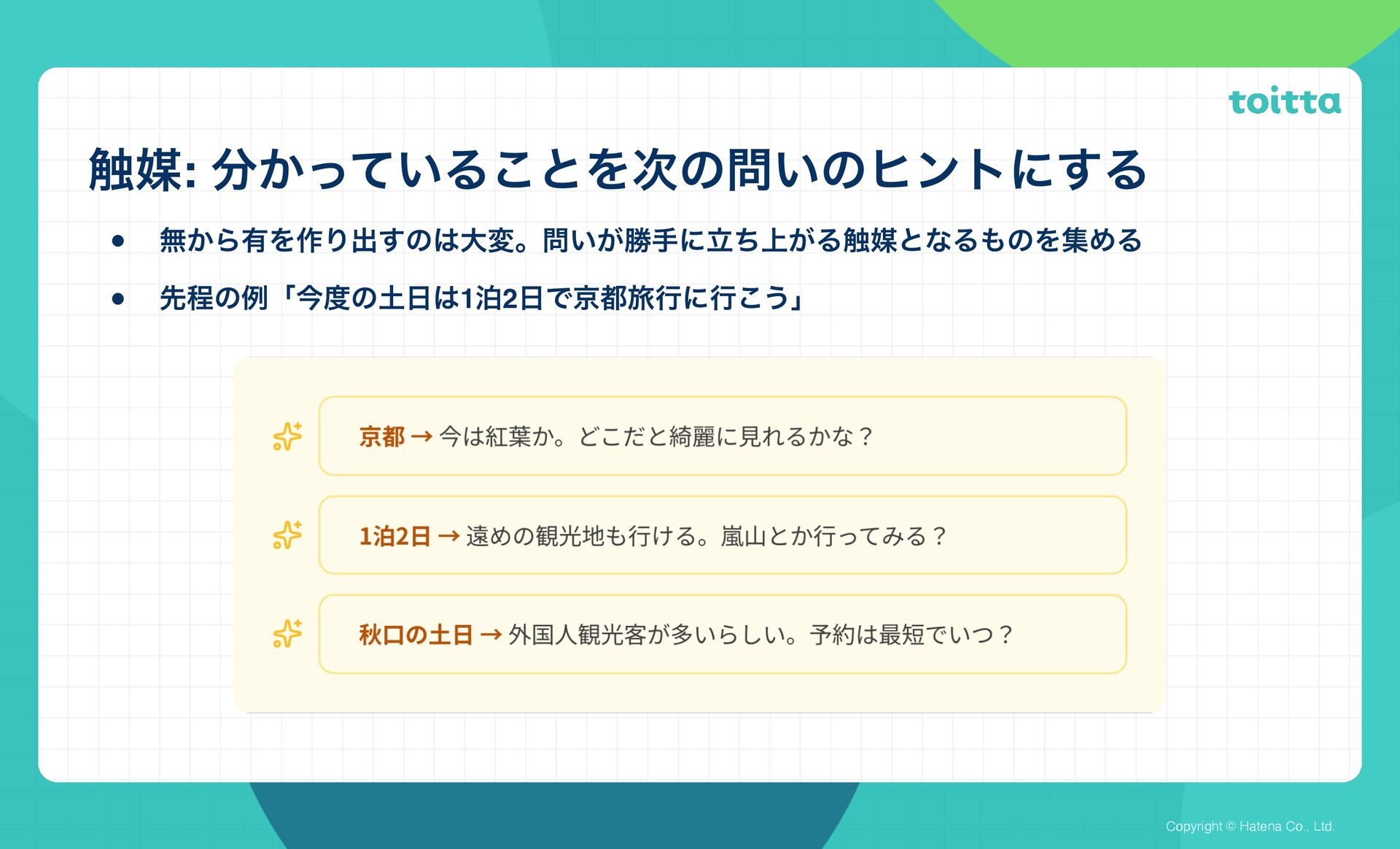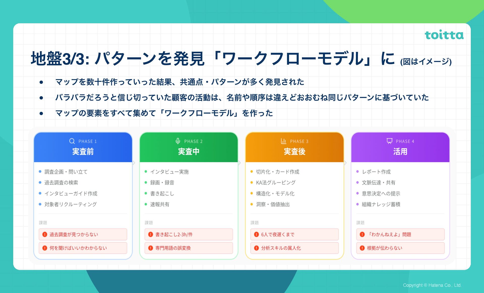 ◦ ػೳؒͷ߹ੑɺސ٬ͷ༻్ࠩɺϓϩμΫτͷະདྷ૾ etc. ◦ ʮސ٬ʹڞ௨͢ΔɺϦαʔν݁Ռͷҙࢥܾఆ׆༻ϋʔυϧΛղ͘ʯΛલఏʹͰ͖Δ ◦ ͡Ό͋ػೳ͔ؒ͋͘Δ͖ɺސ٬͝ͱͷࠩ͜͏ٵऩɺະདྷͩ͜͜ ͱͳΔ • ͍͔Β࿈͞ΕΔ৽ͨͳ͍͕৽ͨͳΩϥʔػೳΛ࿈Εͯ͘Δ(৮ഔ) ◦ ൃݟ͞Ε͍ͨΛඪޠʹมʮҙࢥܾఆΛ10xʹʯ ◦ ͦͷҙࢥܾఆͲ͜Ͱ٧·Δʁ → ͦͷ٧·ΓͲ͏ղ͘ͷ͕Ұ൪10xʹ͍ۙ? ◦ ͜ΕΛ͓ʹ2ؒͷूத߹॓ɻੜ·Εͨແͷϓϩτͷͻͱ͕ͭ৽ػೳask totita