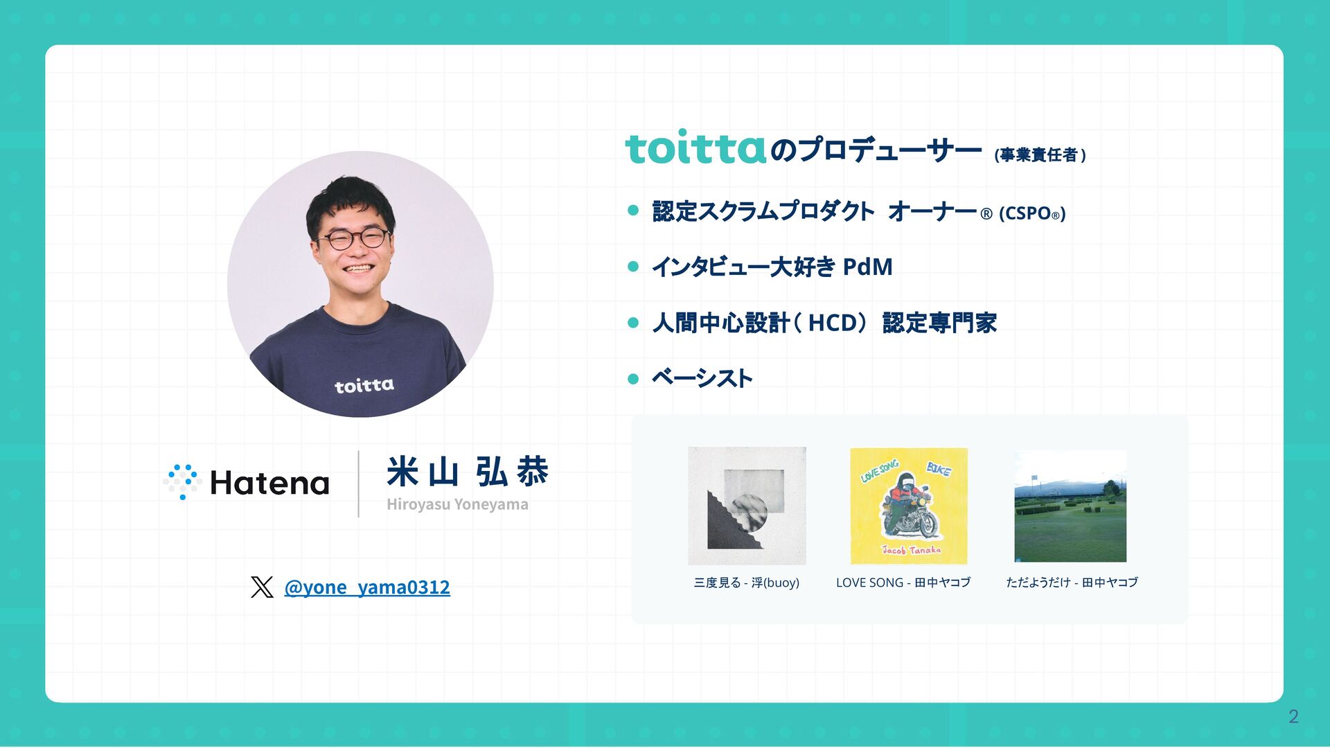 2 @yone_yama0312 のプロデューサー (事業責任者 ) 三度見る - 浮(buoy) LOVE SONG - 田中ヤコブ ただようだけ - 田中ヤコブ Hiroyasu Yoneyama 認定スクラムプロダクト オーナー® (CSPO® ) インタビュー大好き PdM 人間中心設計( HCD) 認定専門家 ベーシスト