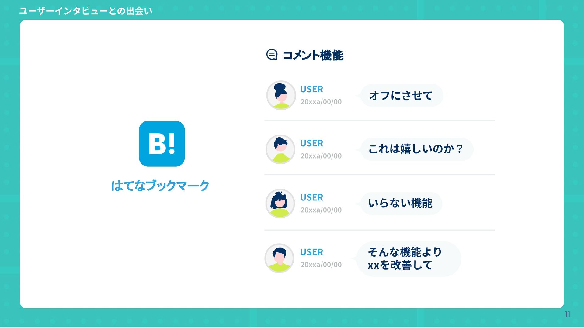 20xxa/00/00 これは嬉しいのか? USER 20xxa/00/00 いらない機能 USER 20xxa/00/00 そんな機能より xxを改善して はてなブックマーク コメント機能 ユーザーインタビューとの出会い