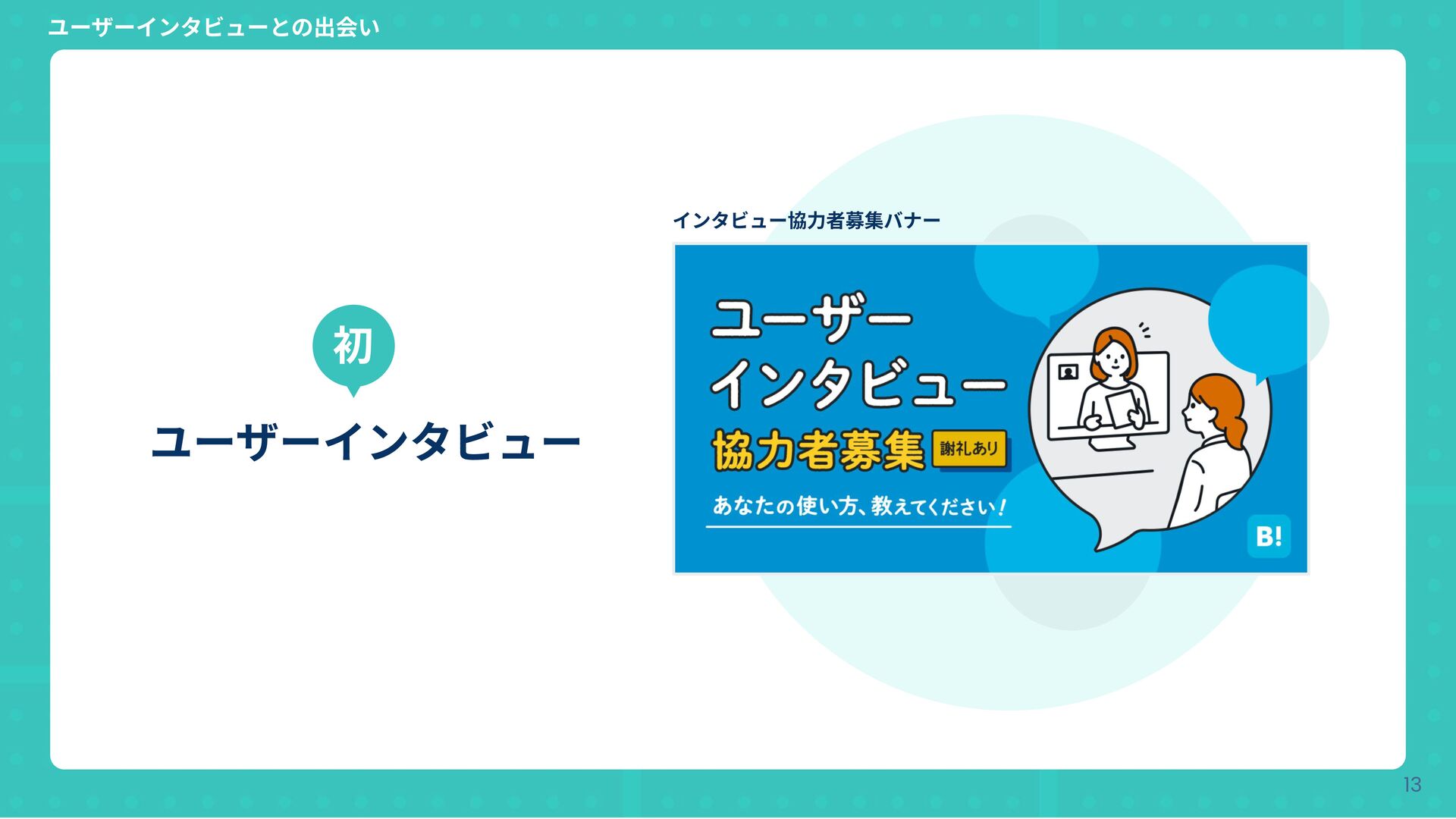 Copyright © Hatena Co., Ltd. 13 ユーザーインタビュー 初 ユーザーインタビューとの出会い インタビュー協⼒者募集バナー