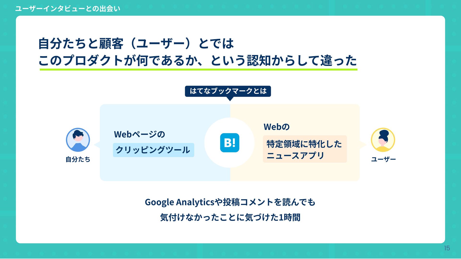 Copyright © Hatena Co., Ltd. 15 Google Analyticsや投稿コメントを読んでも 気付けなかったことに気づけた1時間 ⾃分たちと顧客(ユーザー)とでは