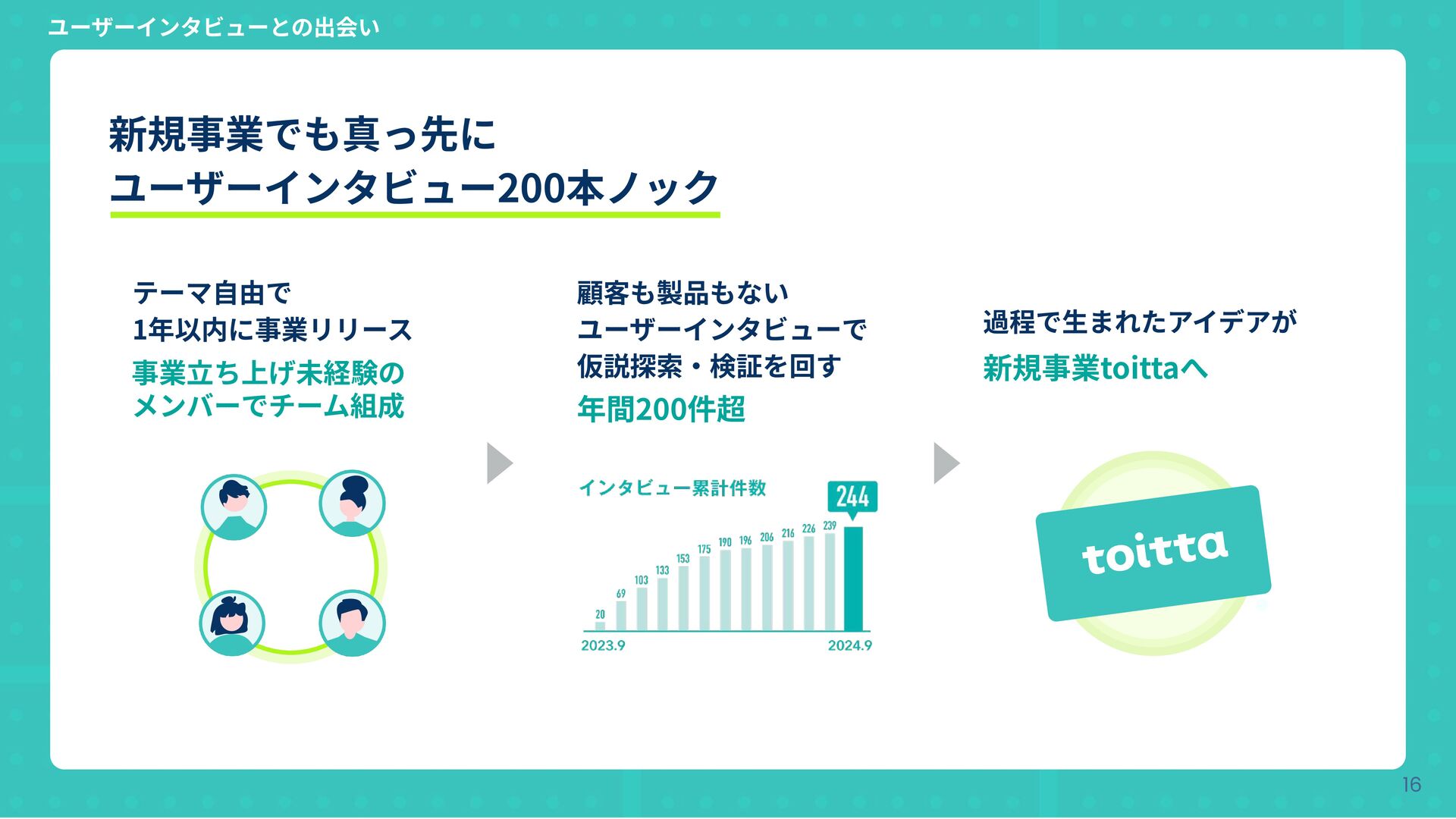 事業⽴ち上げ未経験の メンバーでチーム組成 顧客も製品もない ユーザーインタビューで 仮説探索‧検証を回す 年間200件超 過程で⽣まれたアイデアが 新規事業toittaへ ユーザーインタビューとの出会い