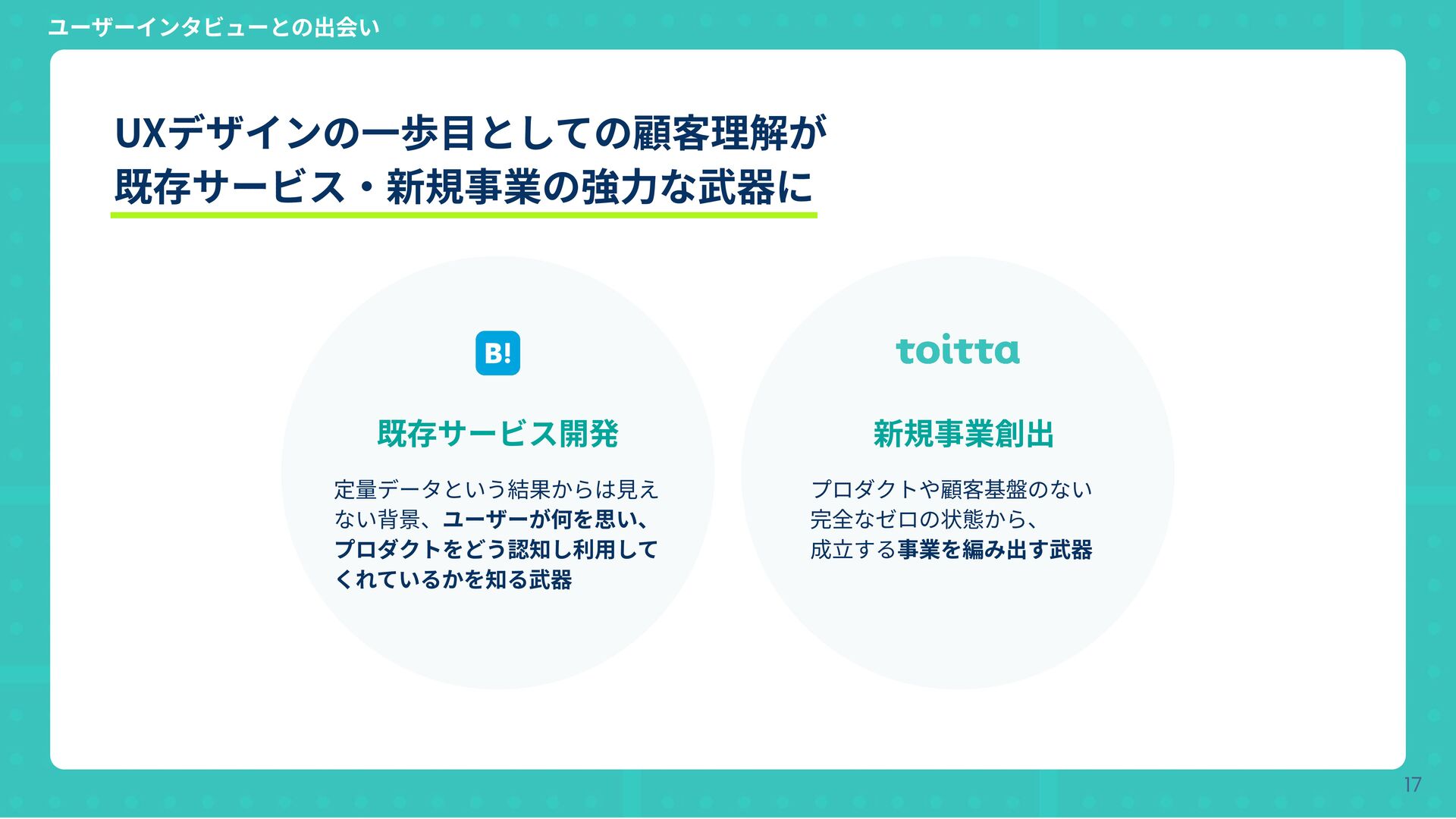 Copyright © Hatena Co., Ltd. 17 UXデザインの⼀歩⽬としての顧客理解が 既存サービス‧新規事業の強⼒な武器に 既存サービス開発 新規事業創出
