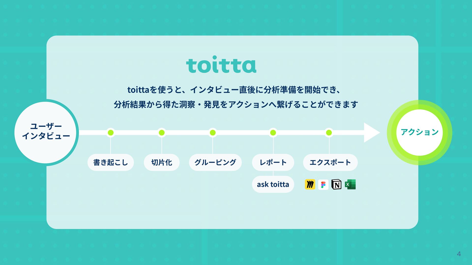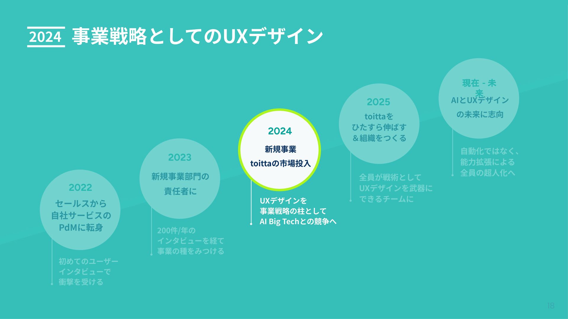- 未 来 AIとUXデザイン の未来に志向 200件/年の インタビューを経て 事業の種をみつける ⾃動化ではなく、 能⼒拡張による 全員の超⼈化へ 初めてのユーザー インタビューで 衝撃を受ける 2022 セールスから ⾃社サービスの PdMに転⾝ UXデザインを 事業戦略の柱として AI Big Techとの競争へ 2024 新規事業 toittaの市場投⼊ 2025 組織戦術としてのUXデザイン 全員が戦術として UXデザインを武器に できるチームに 2025 toittaを ひたすら伸ばす &組織をつくる