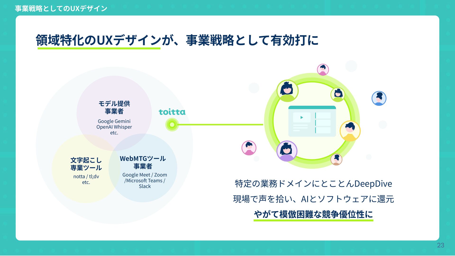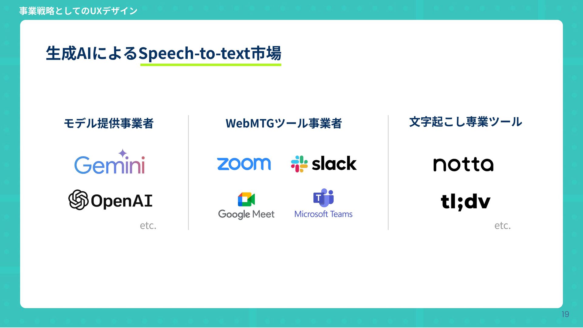 Copyright © Hatena Co., Ltd. 19 事業戦略としてのUXデザイン ⽣成AIによるSpeech-to-text市場 モデル提供事業者 WebMTGツール事業者
