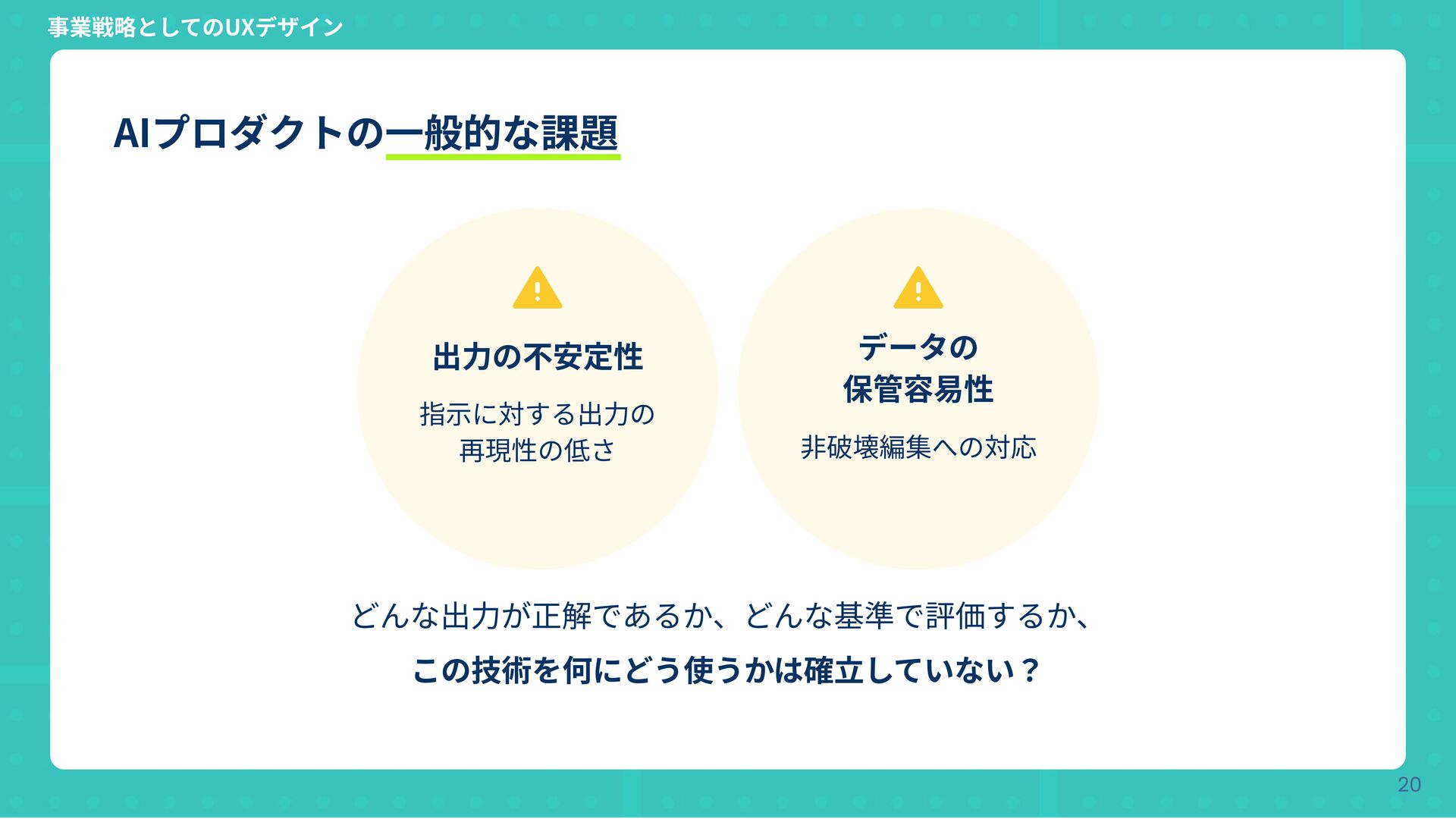 どんな出⼒が正解であるか、どんな基準で評価するか、 この技術を何にどう使うかは確⽴していない? 指⽰に対する出⼒の 再現性の低さ ⾮破壊編集への対応 事業戦略としてのUXデザイン