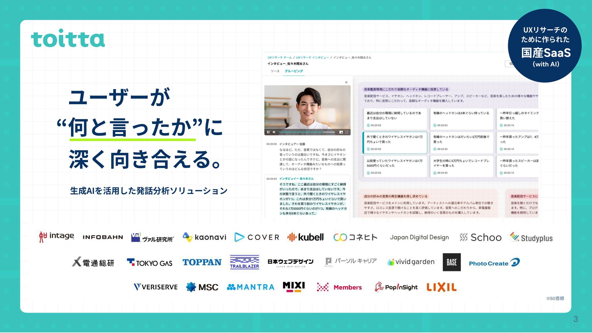 深く向き合える。 ⽣成AIを活⽤した発話分析ソリューション ユーザーが 3 “何と⾔ったか”に 国産SaaS UXリサーチの ために作られた (with AI)