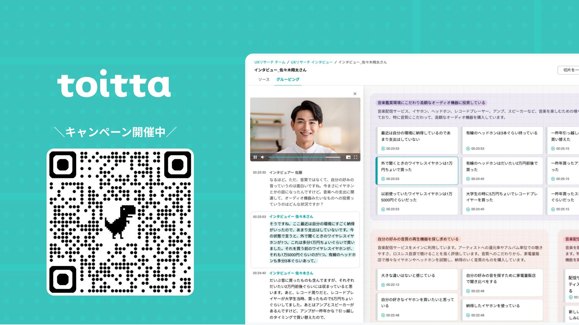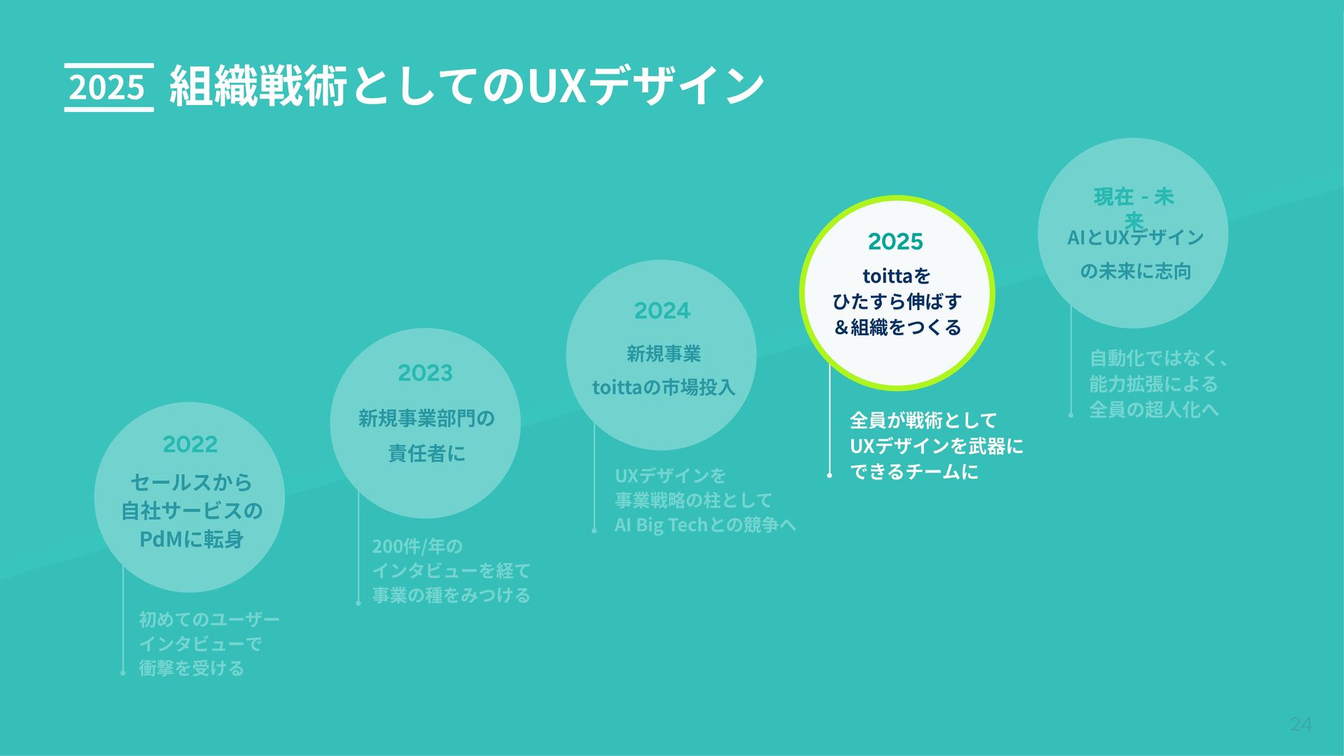 toittaを ひたすら伸ばす &組織をつくる 現在 - 未 来 AIとUXデザイン の未来に志向 全員が戦術として UXデザインを武器に できるチームに ⾃動化ではなく、 能⼒拡張による 全員の超⼈化へ 2022 セールスから ⾃社サービスの PdMに転⾝ 初めてのユーザー インタビューで 衝撃を受ける 200件/年の インタビューを経て 事業の種をみつける 2024 事業戦略としてのUXデザイン UXデザインを 事業戦略の柱として AI Big Techとの競争へ 2024 新規事業 toittaの市場投⼊