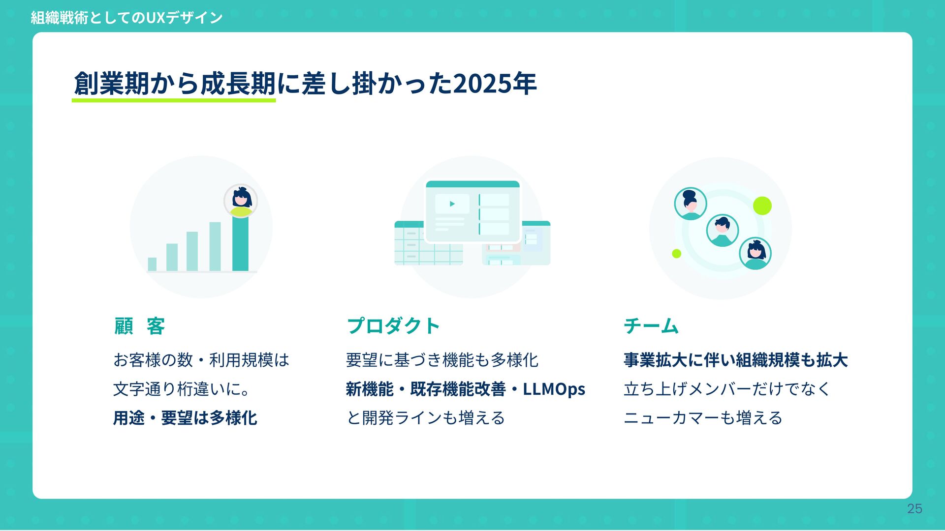 チーム 要望に基づき機能も多様化 新機能‧既存機能改善‧LLMOps と開発ラインも増える お客様の数‧利⽤規模は ⽂字通り桁違いに。 ⽤途‧要望は多様化 事業拡⼤に伴い組織規模も拡⼤ ⽴ち上げメンバーだけでなく ニューカマーも増える 組織戦術としてのUXデザイン