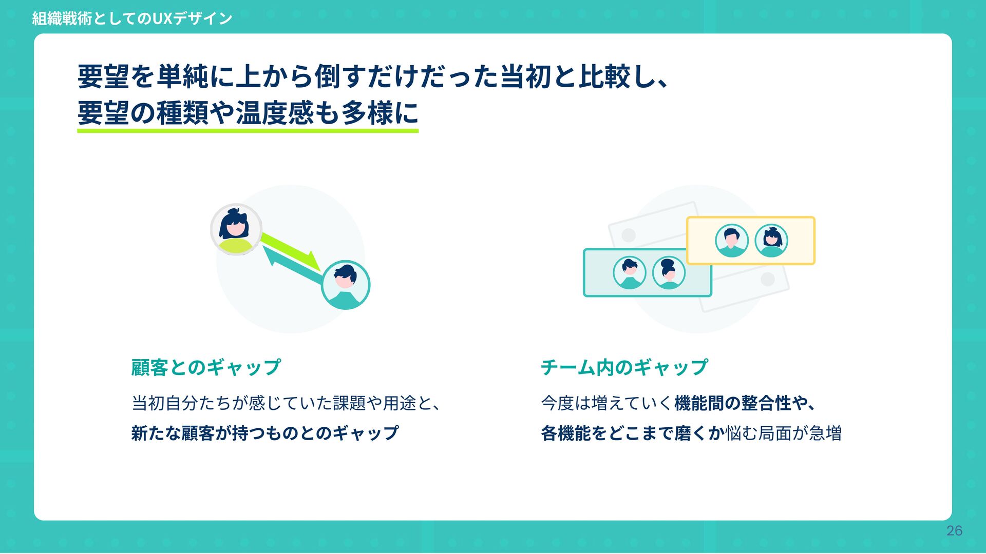 当初⾃分たちが感じていた課題や⽤途と、 新たな顧客が持つものとのギャップ 今度は増えていく機能間の整合性や、 各機能をどこまで磨くか悩む局⾯が急増 組織戦術としてのUXデザイン