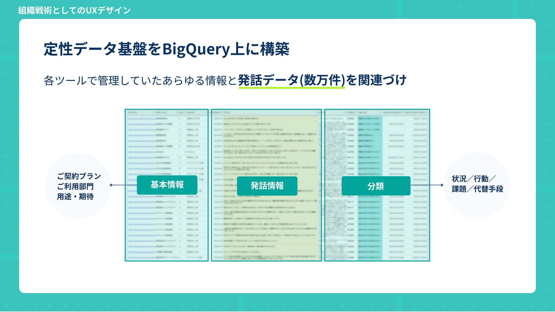 状況∕⾏動∕ 課題∕代替⼿段 定性データ基盤をBigQuery上に構築 組織戦術としてのUXデザイン 基本情報 分類