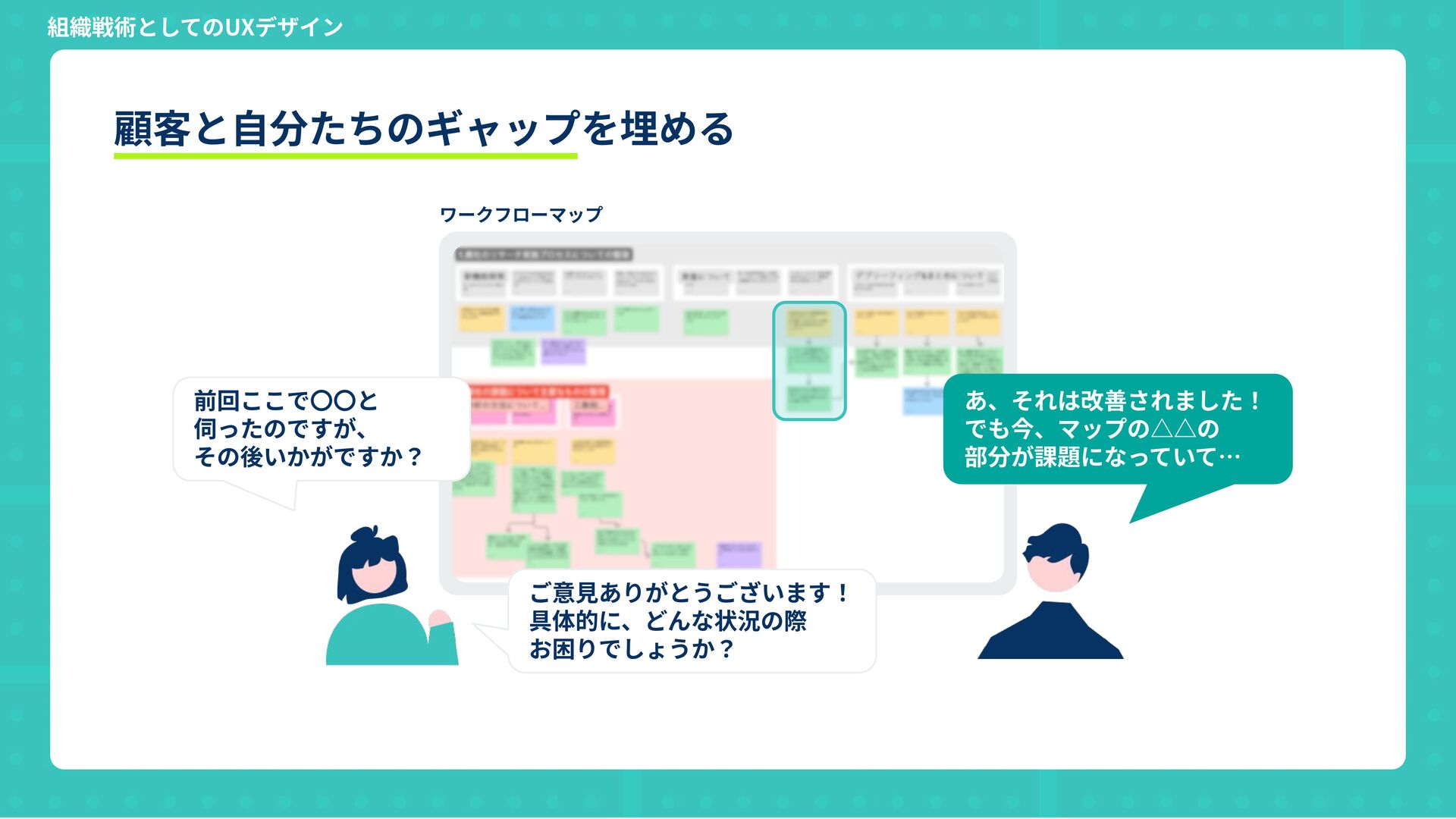 あ、それは改善されました! でも今、マップの△△の 部分が課題になっていて… ご意⾒ありがとうございます! 具体的に、どんな状況の際 お困りでしょうか? 組織戦術としてのUXデザイン