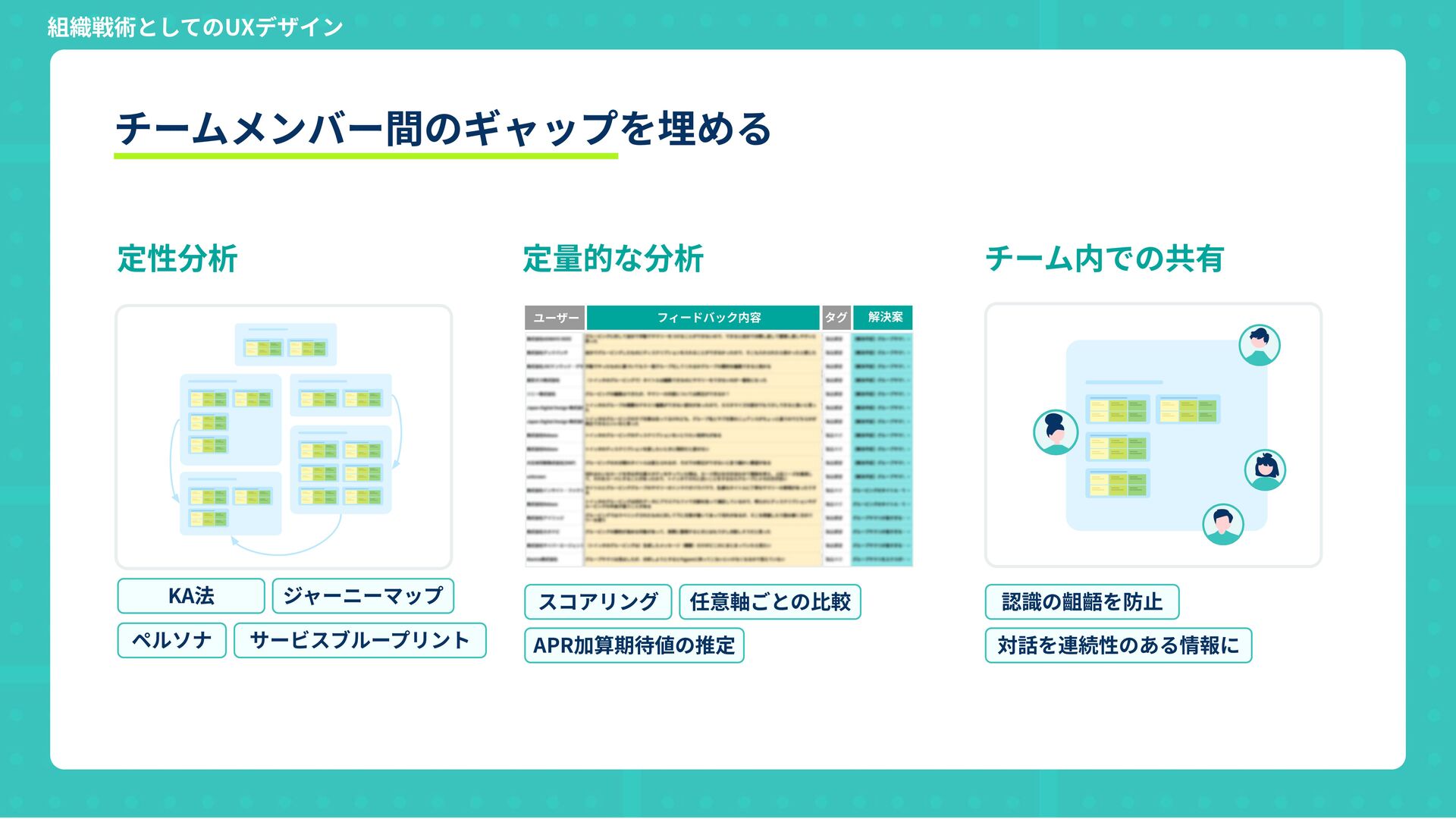 タグ 解決案 フィードバック内容 チームメンバー間のギャップを埋める スコアリング 任意軸ごとの⽐較 APR加算期待値の推定 認識の齟齬を防⽌ 対話を連続性のある情報に KA法 ジャーニーマップ ペルソナ サービスブループリント