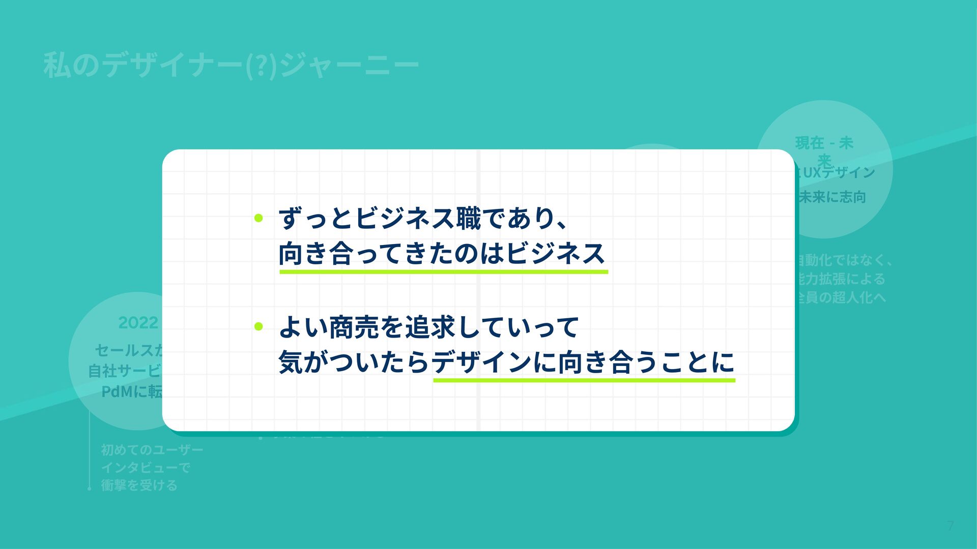 2023 新規事業部⾨の 責任者に 2024 新規事業 toittaの市場投⼊ 2025 toittaを ひたすら伸ばす &組織をつくる 現在 - 未 来 AIとUXデザイン の未来に志向 初めてのユーザー インタビューで 衝撃を受ける 200件/年の インタビューを経て 事業の種をみつける UXデザインを 事業戦略の柱として AI Big Techとの競争へ 全員が戦術として UXデザインを武器に できるチームに ⾃動化ではなく、 能⼒拡張による 全員の超⼈化へ 私のデザイナー(?)ジャーニー ずっとビジネス職であり、 向き合ってきたのはビジネス よい商売を追求していって 気がついたらデザインに向き合うことに