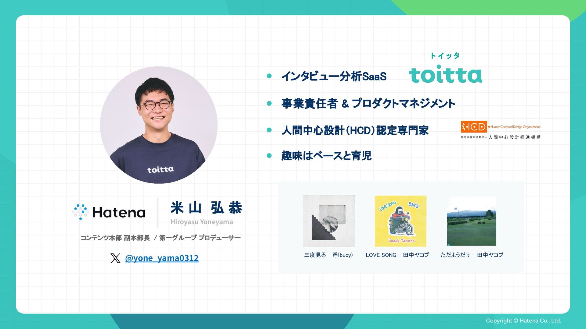 米 山 弘 恭 @yone_yama0312 三度見る - 浮(buoy) LOVE SONG - 田中ヤコブ ただようだけ - 田中ヤコブ Hiroyasu Yoneyama ト イ ッ タ コンテンツ本部 副本部長 / 第一グループ プロデューサー Copyright © Hatena Co., Ltd.